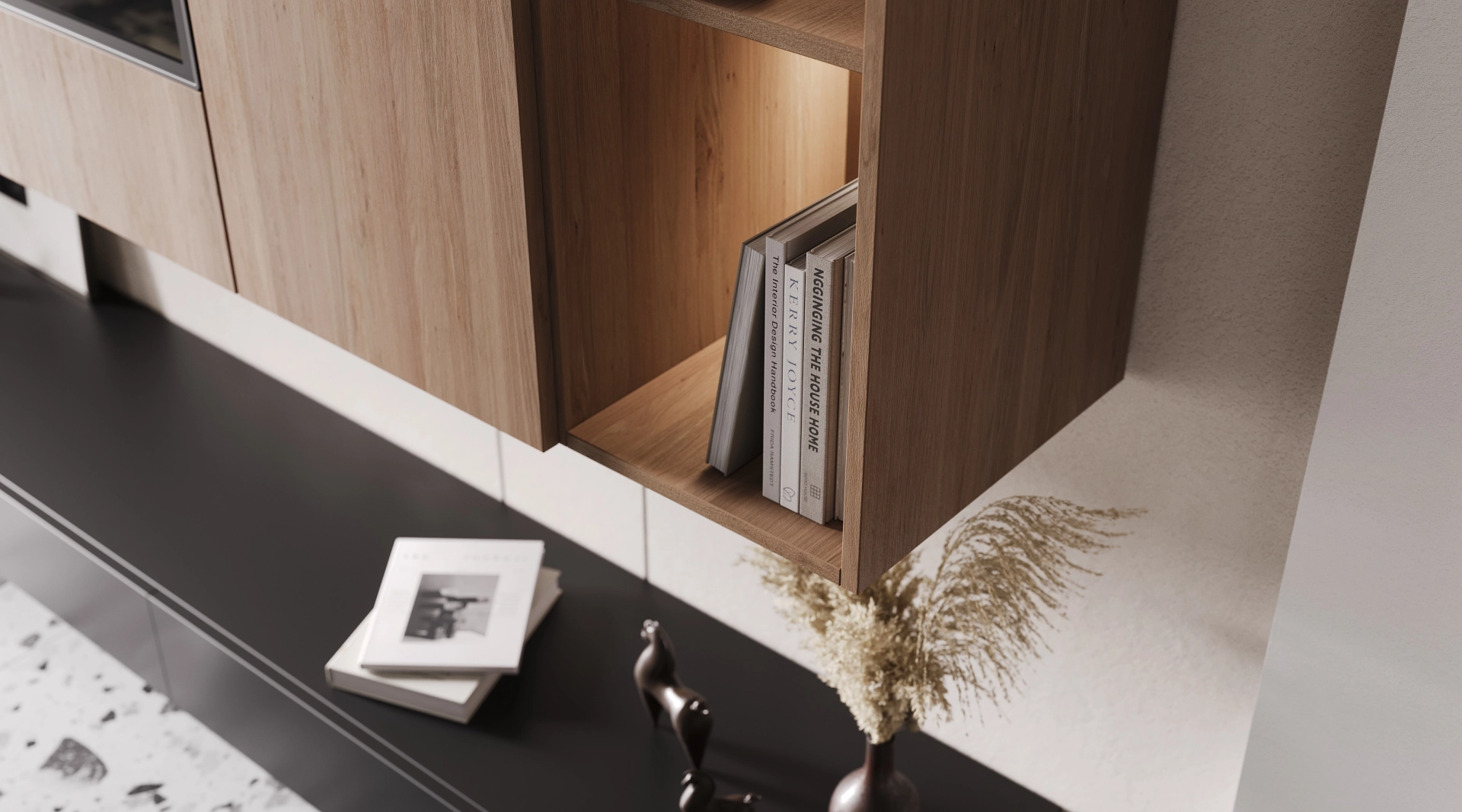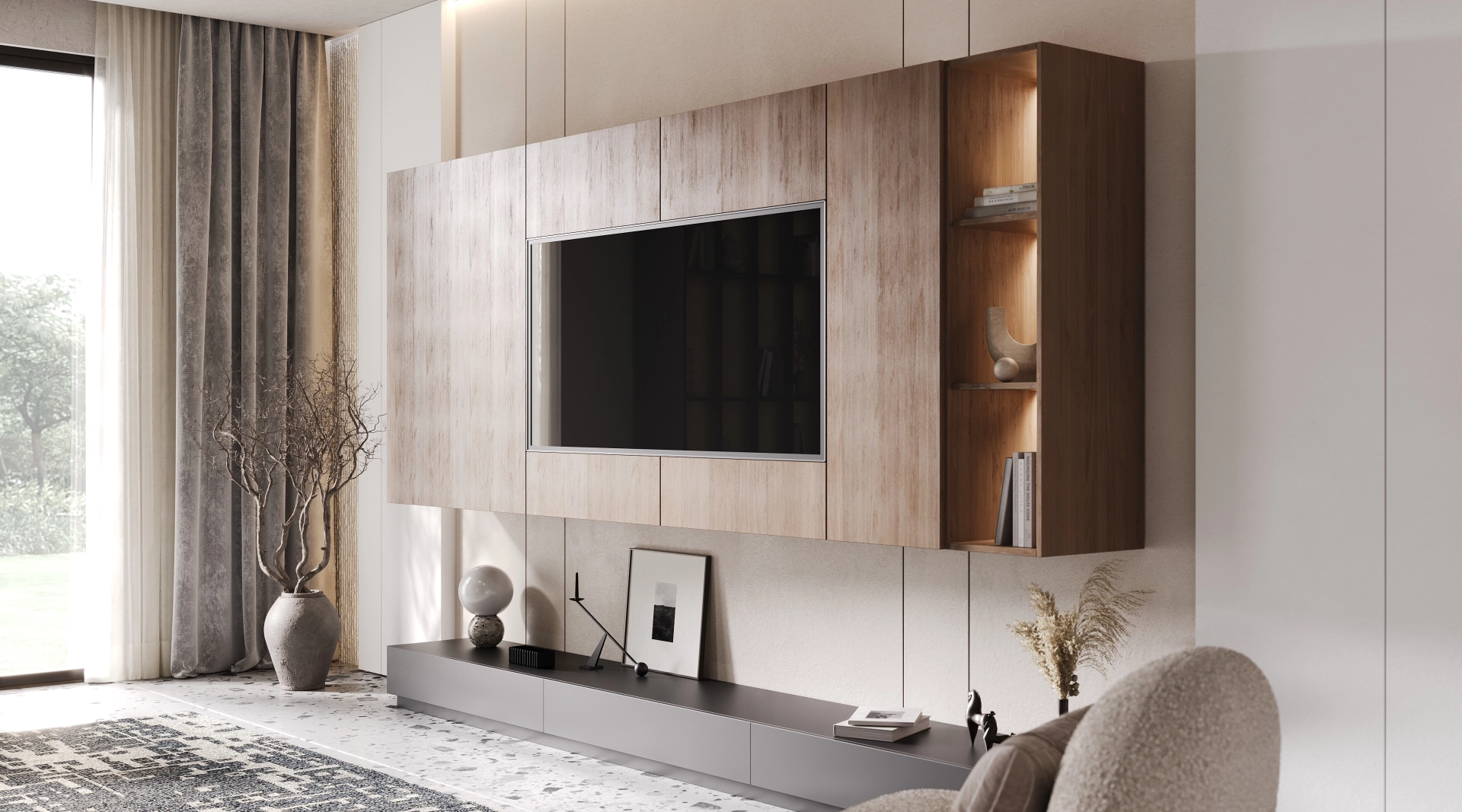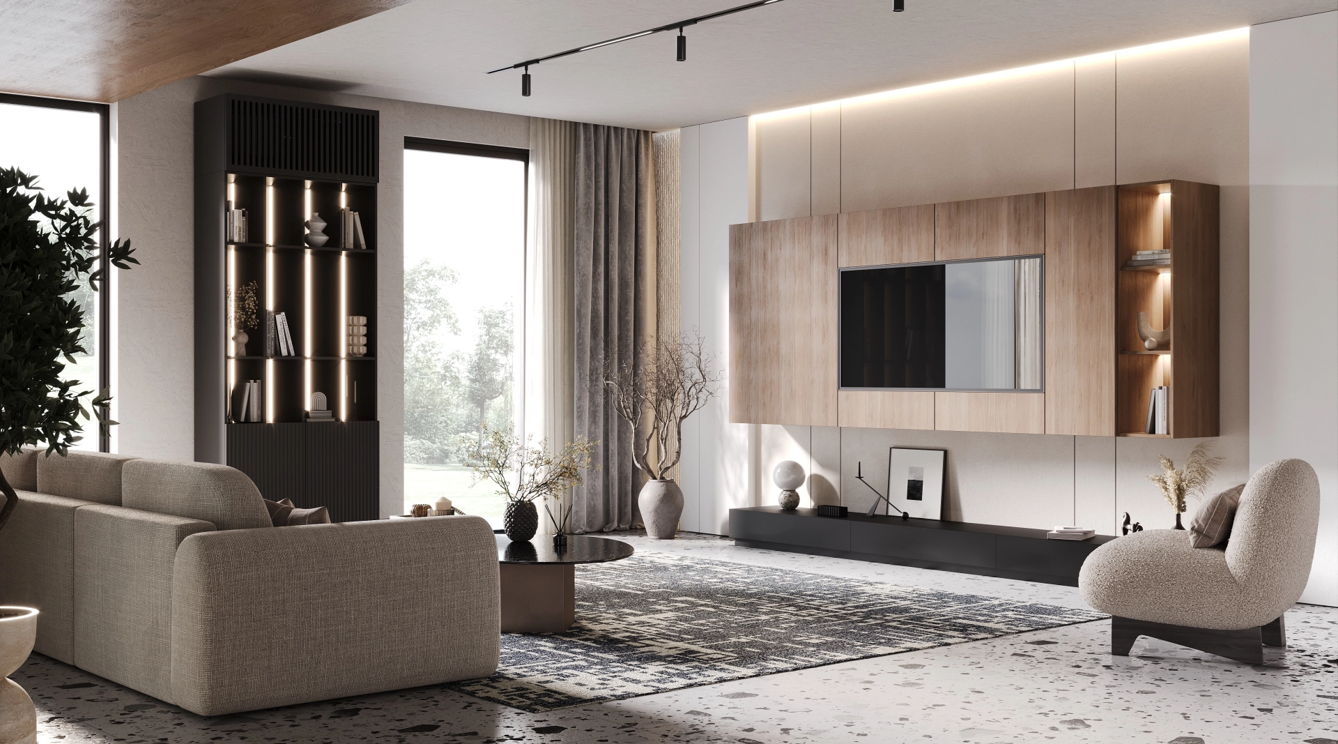 Гостиная воплощает идею единства природы и современного стиля. Мягкие нейтральные оттенки служат фоном для насыщенных древесных текстур, а чёткие линии мебели подчёркивают лаконичность композиции. Интегрированные решения для хранения, умные системы зонирования и адаптивная мебель позволяют гибко подстраивать пространство под любые задачи. Это пространство для ценителей осознанного комфорта, где каждая деталь подчёркивает благородство естественных форм и текстур.