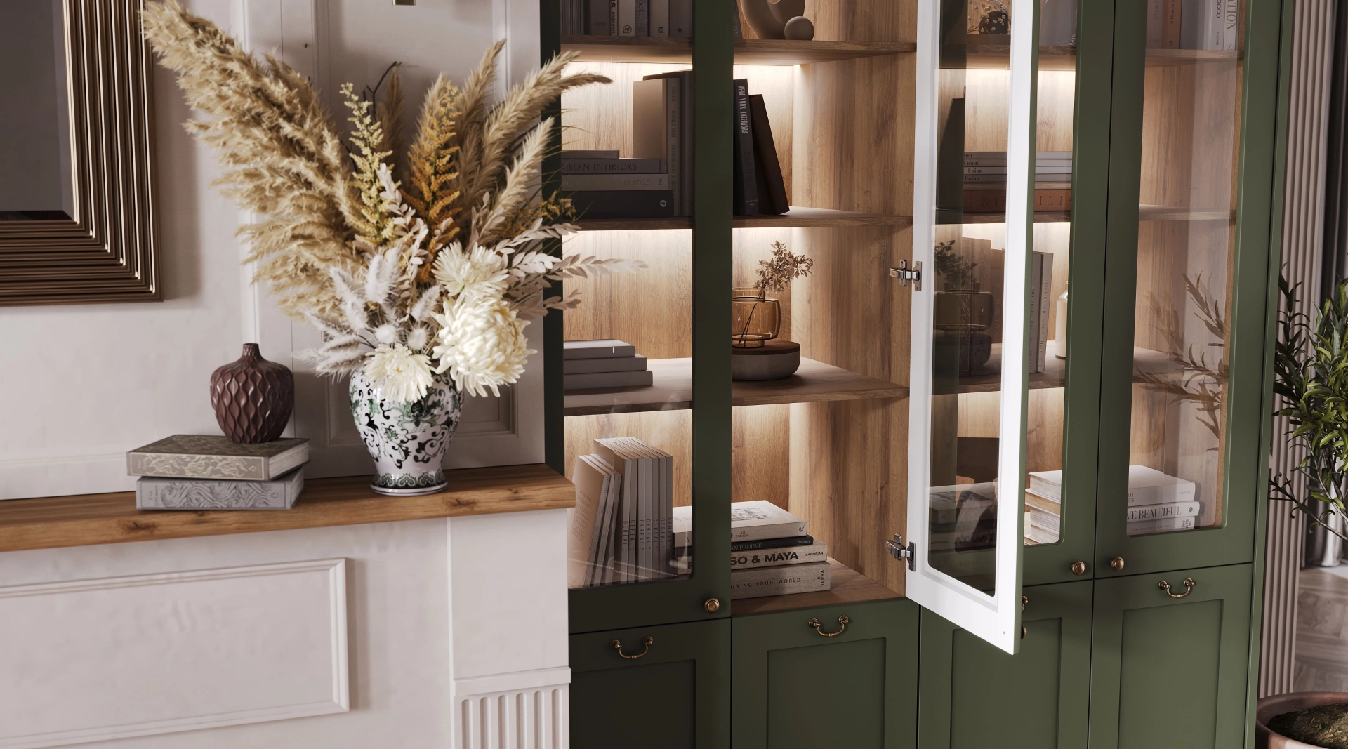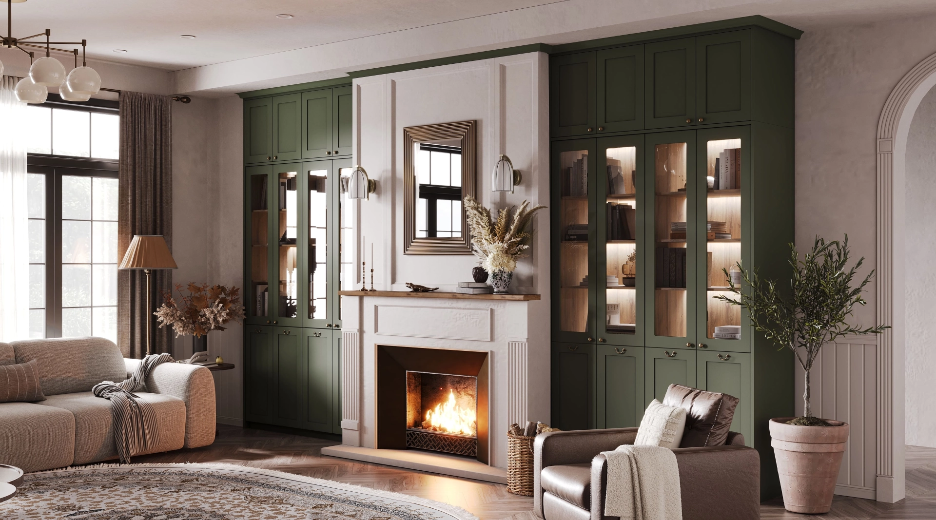 Гостиная Foresthill - это воплощение гармонии природы и домашнего тепла. Глубокий оттенок зелёного создает ощущение уединённого лесного уголка, где каждый элемент дышит спокойствием и умиротворённостью. В сердце этой гостиной — камин, который задаёт тон всему пространству. Он не просто элемент декора: это источник физического тепла, эмоциональный центр притяжения и визуальный акцент, оживляющий интерьер игрой света и тени.