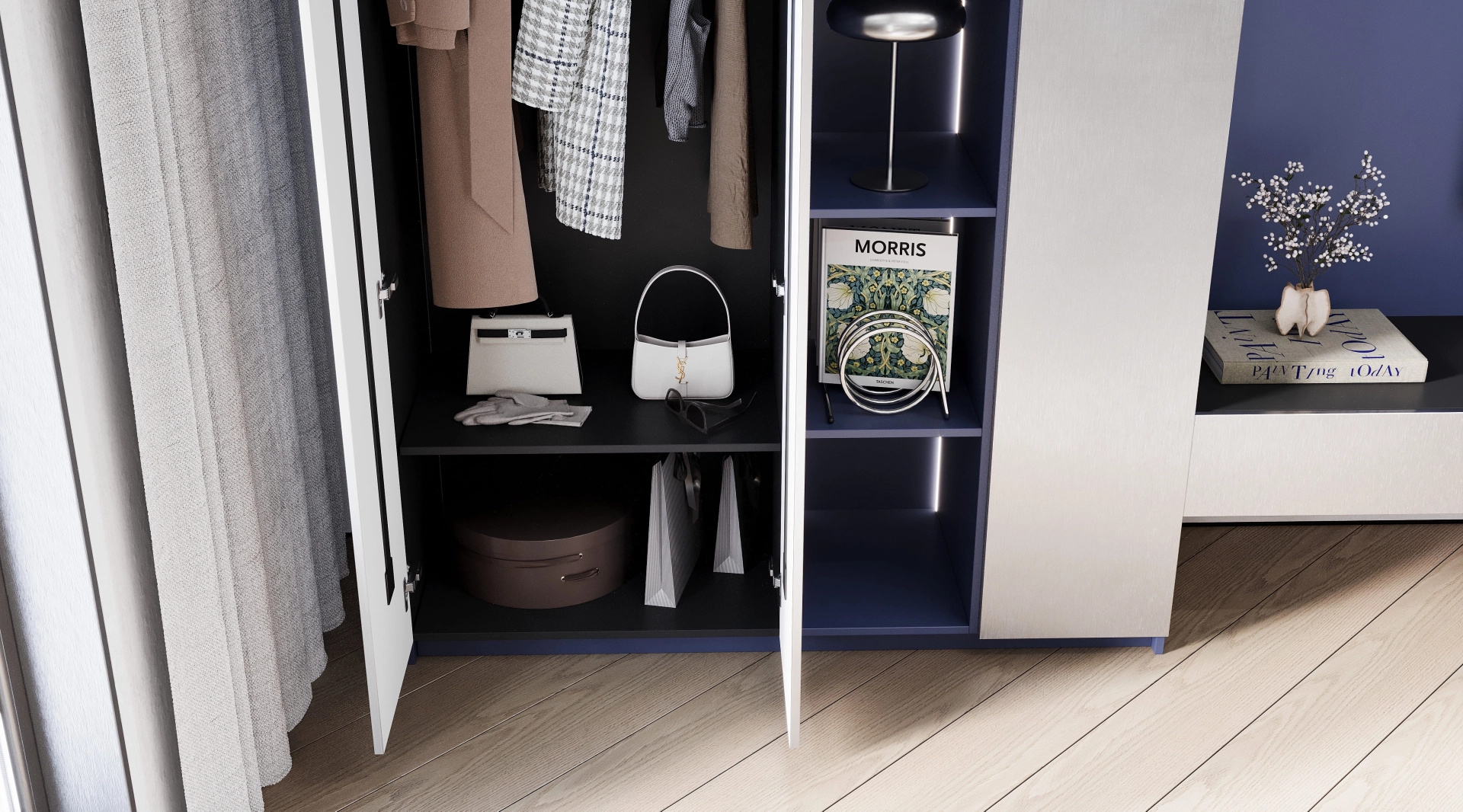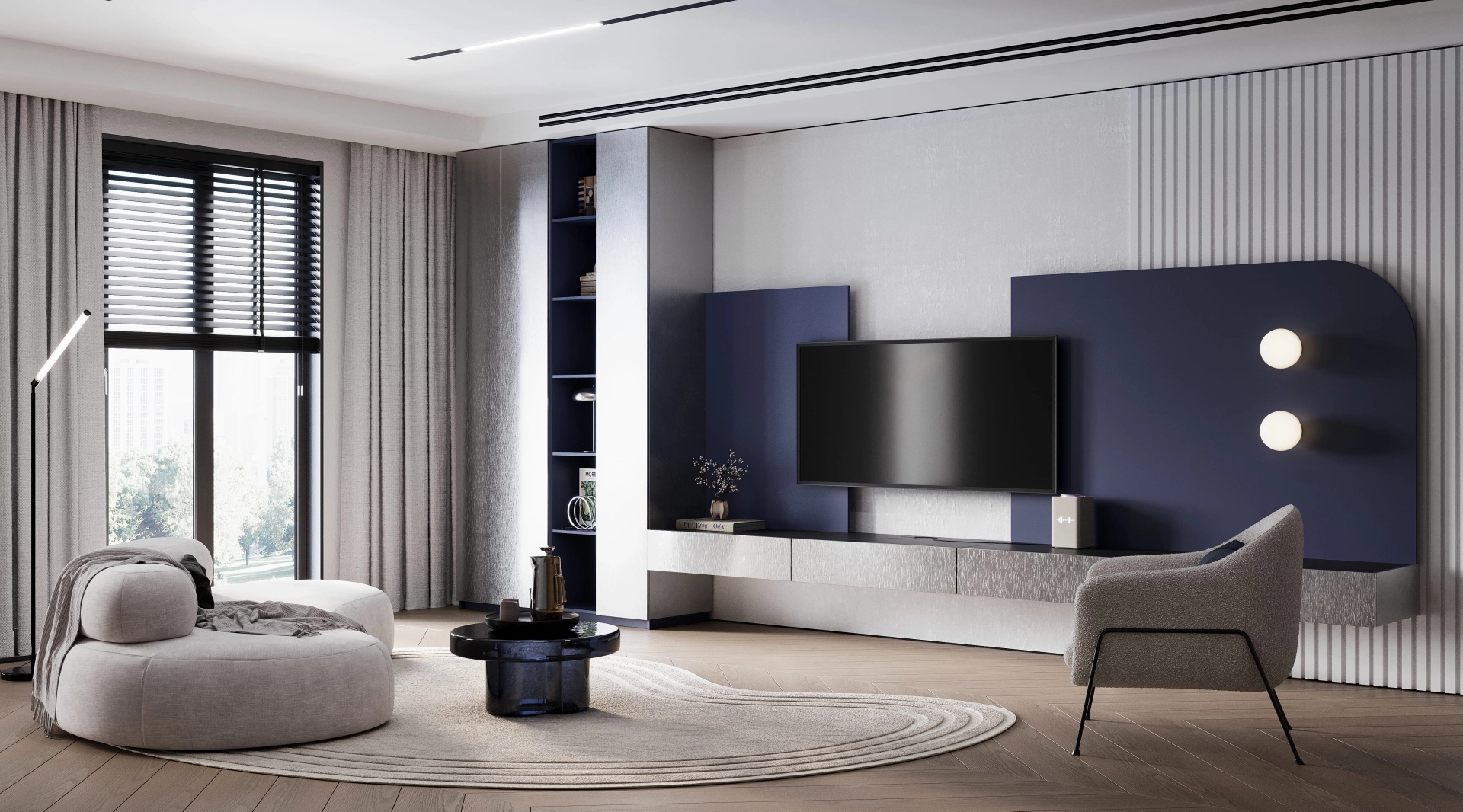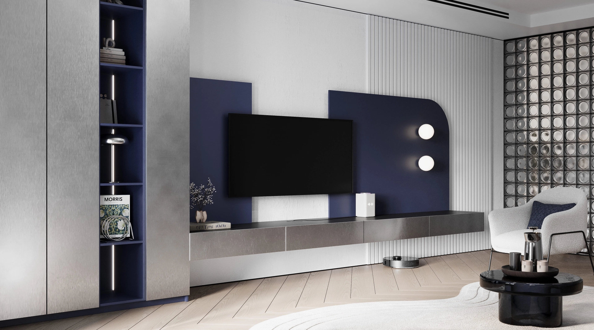 Гостиная Gleaming - смелый эксперимент на стыке цвета, текстуры и технологии. В его основе, напряжённый, но гармоничный диалог: глубина насыщенного ультрамарина вступает в игру с холодными металлическими фактурами, создавая атмосферу одновременно драматичную и утончённую. Это интерьер, который не просто радует глаз, но и провоцирует на размышления о природе современного дизайна.