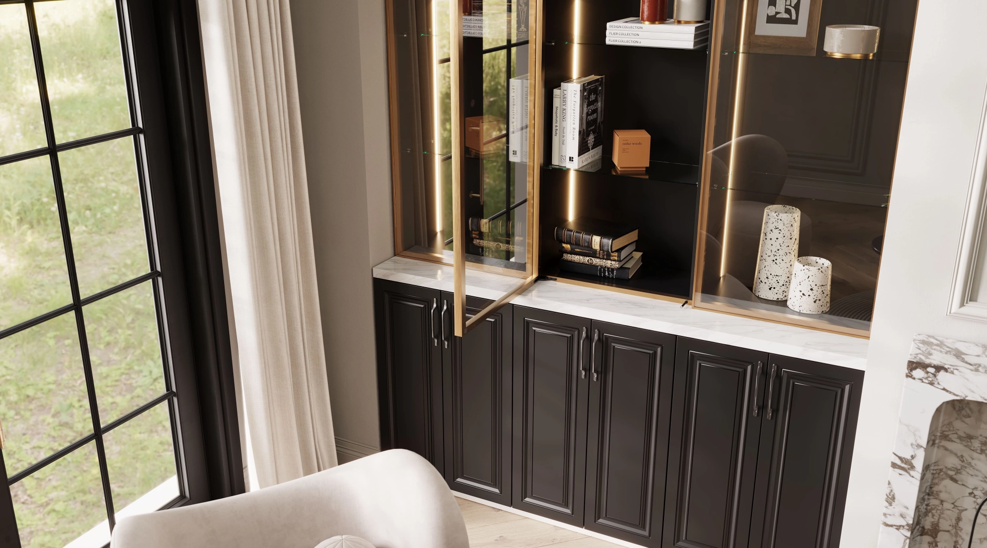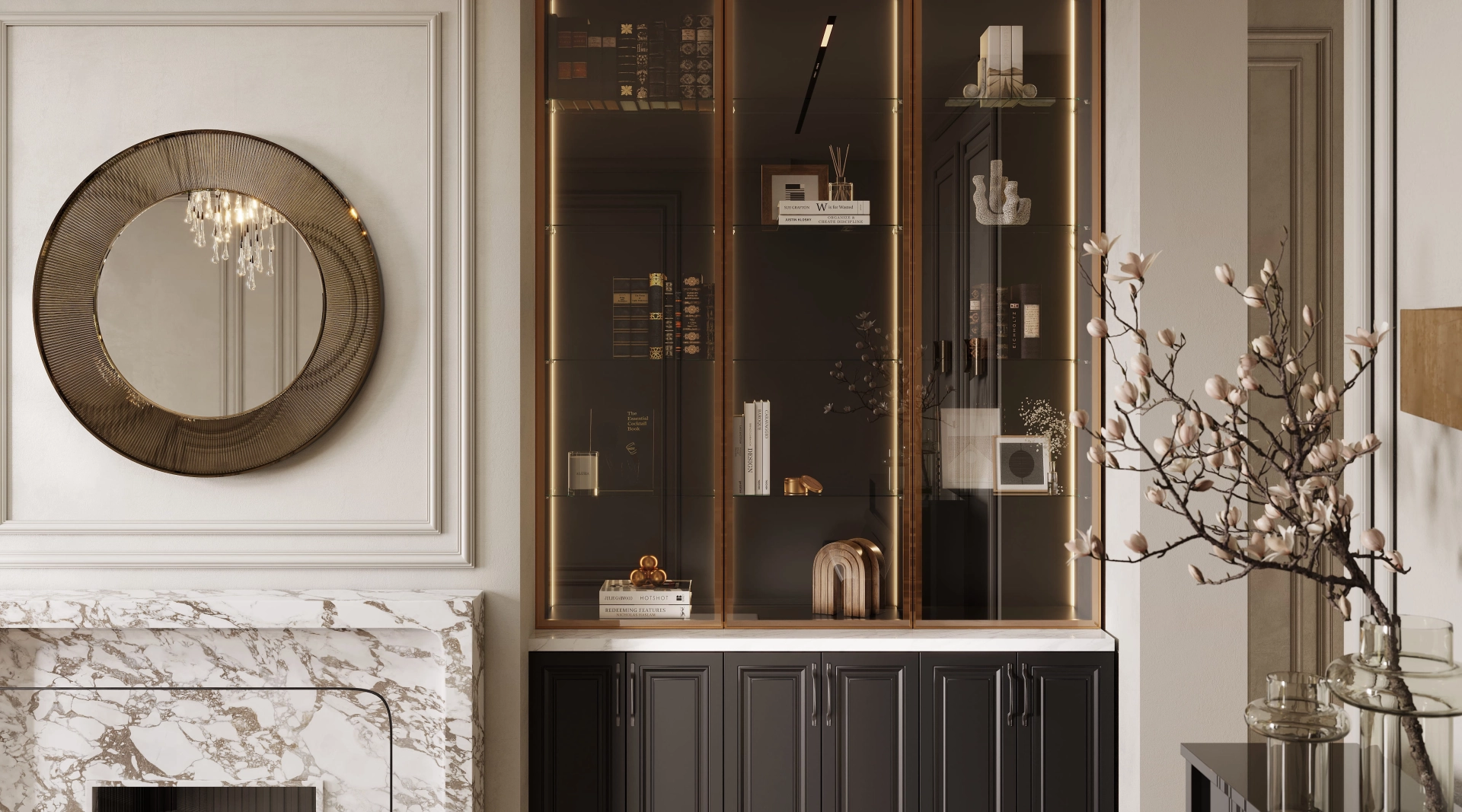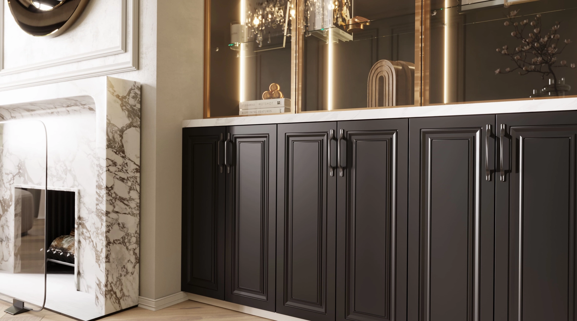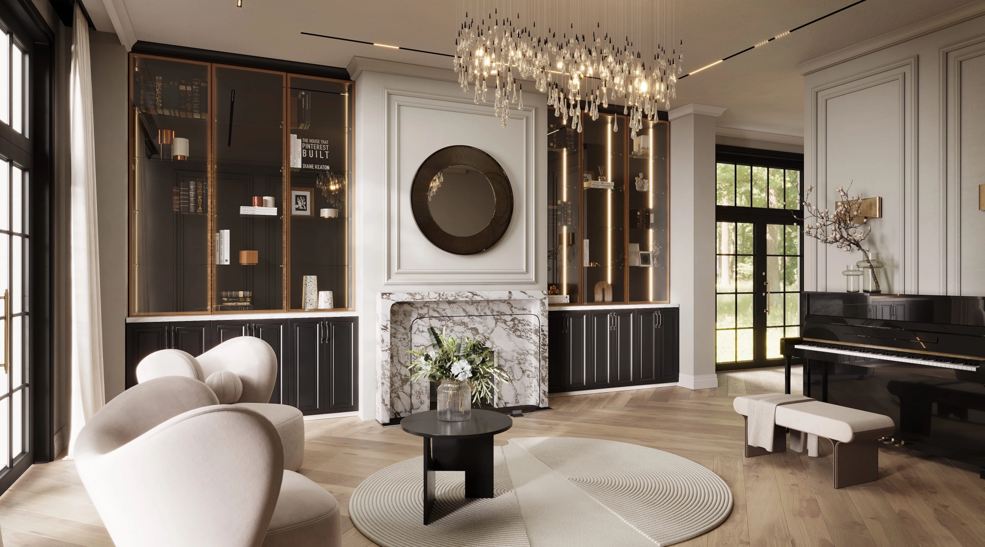 Безупречная симметрия, где черное и белое ведут тихий диалог, а золото звучит тонким акцентом. Французский стиль здесь - это не декор, а состояние. Благородство проступает в идеальных пропорциях, в игре света на стекле витрин, в глубокой тишине, которую хранит пространство. Камин - не просто очаг, а сакральный центр интерьера, вокруг которого выстраивается вся гармония. Пространство дышит аристократической сдержанностью, где каждая деталь - часть безупречного целого.