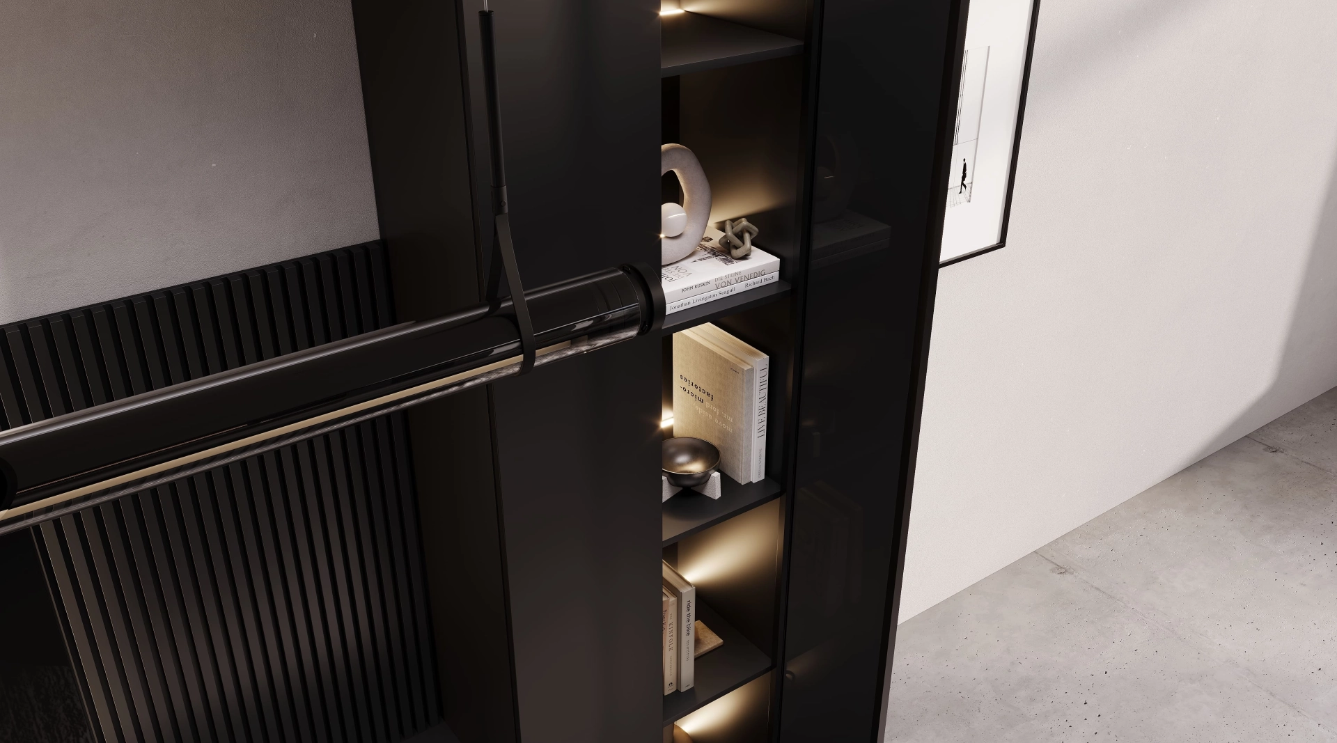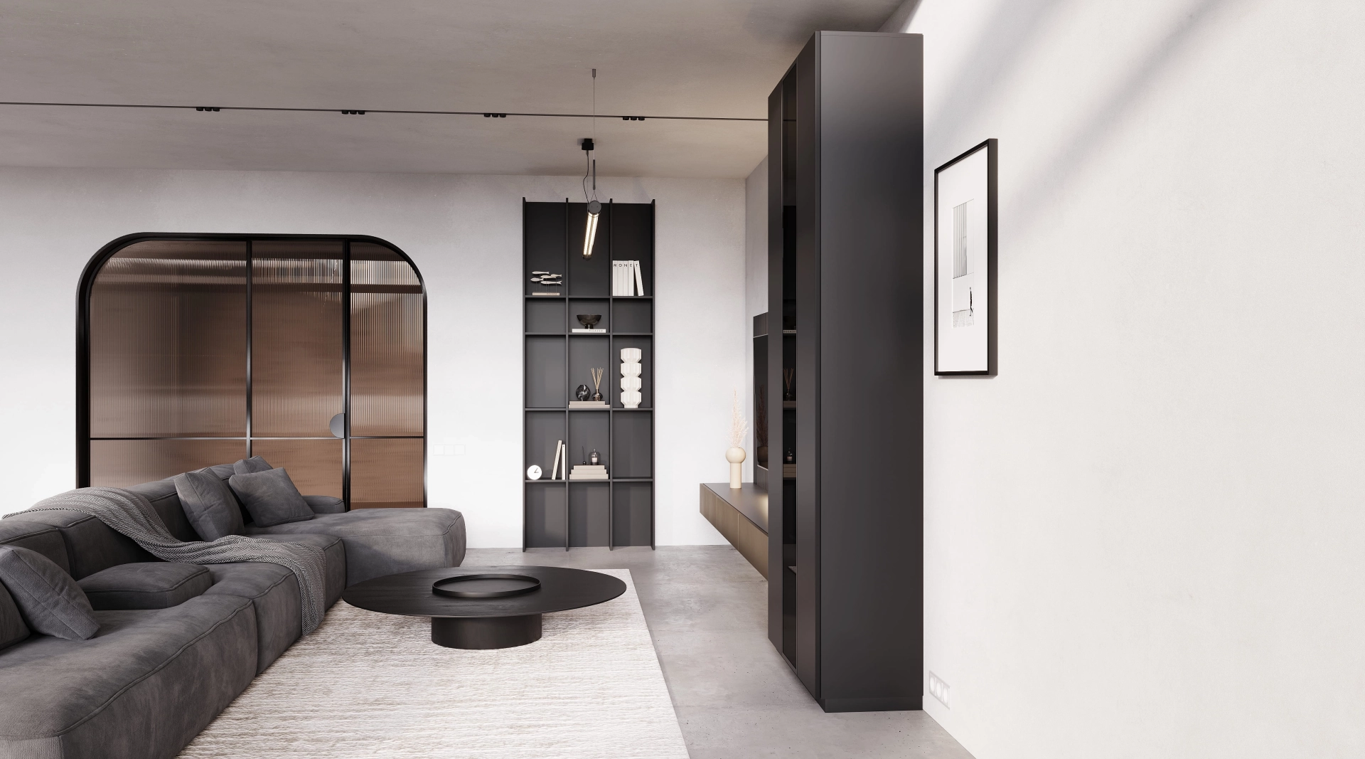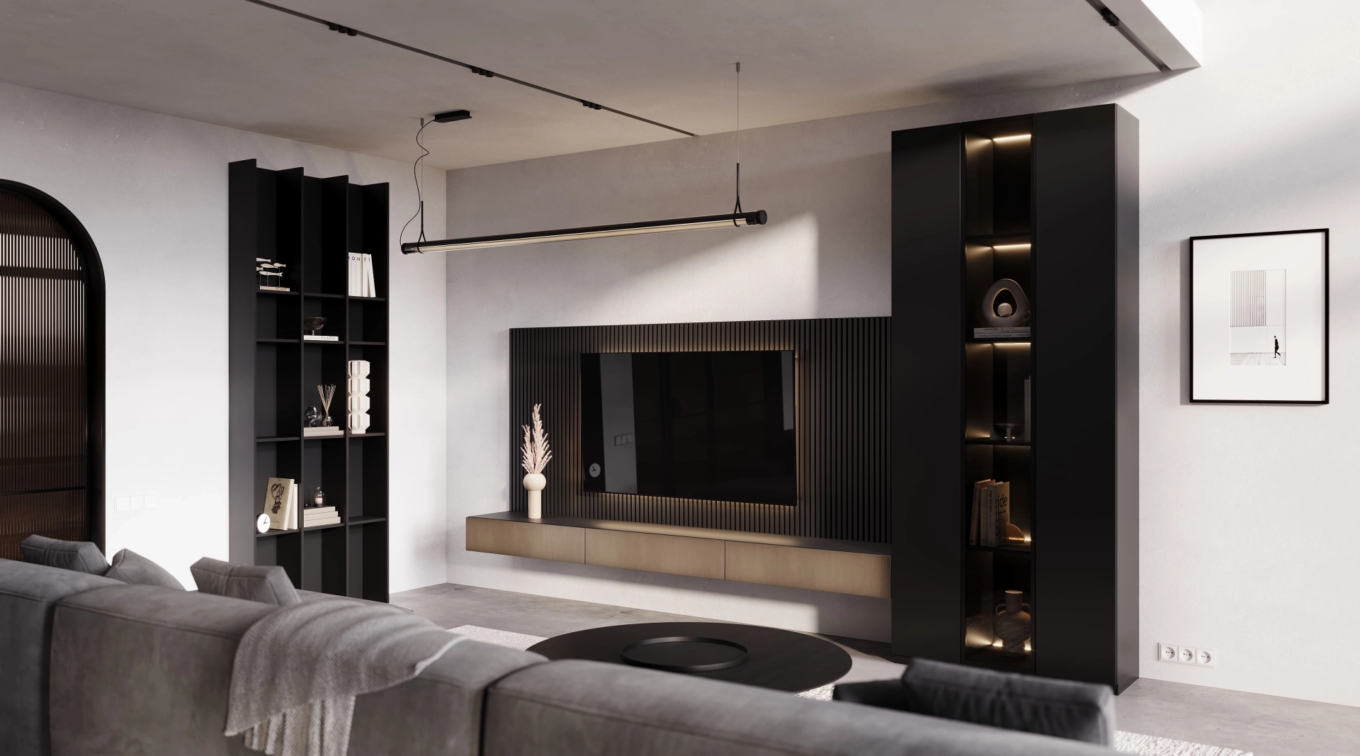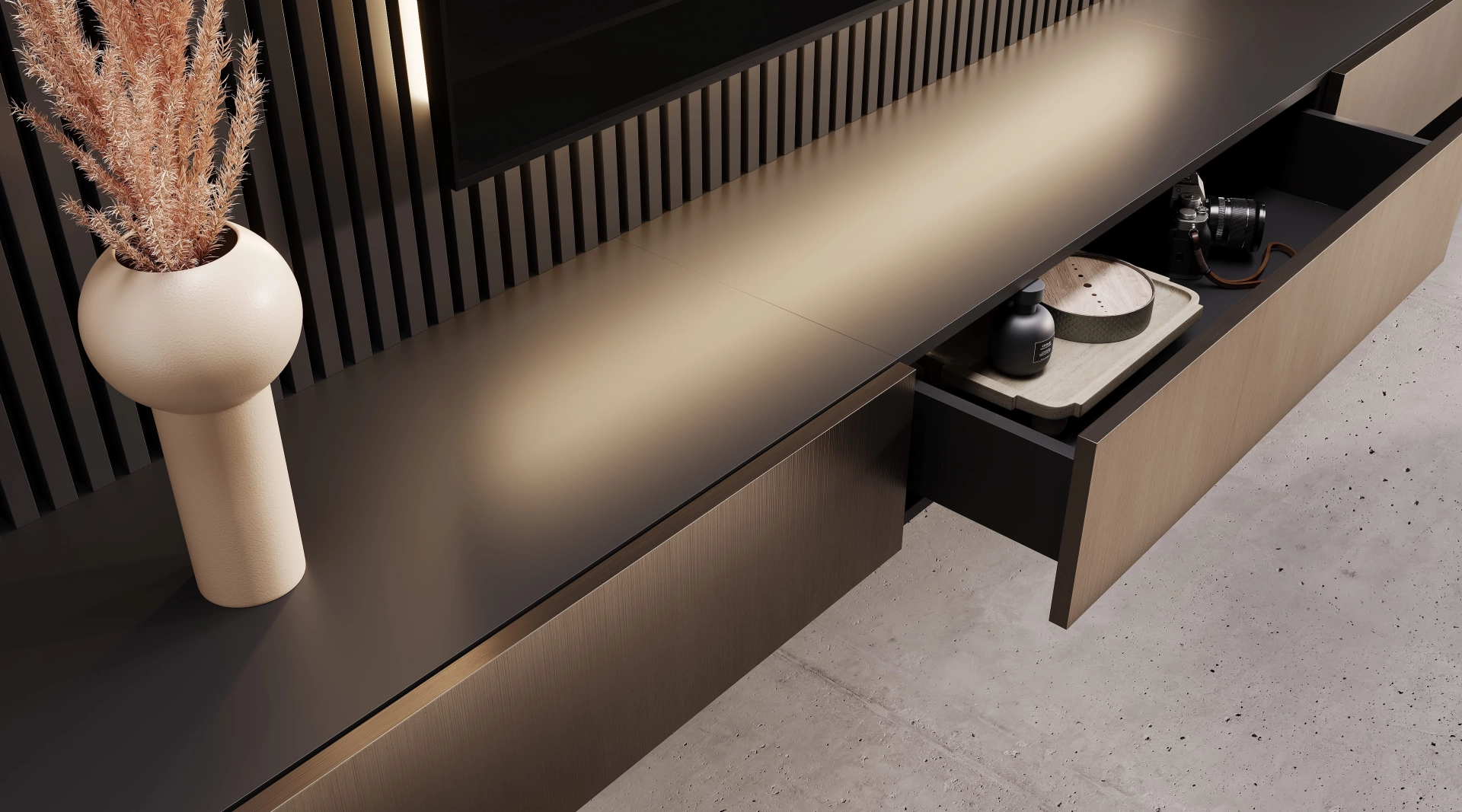 Глубокий графит и теплая латунь вступают в сложную хореографию, где матовые поверхности контрастируют с бликами. Резкие тени и смелые световые акценты создают драматический эффект, подчеркивая скульптурность форм. Латунные фасады консоли горят, как фрагменты заката в сумерках мегаполиса, а графитовые поверхности добавляют глубину. Гостиная Midnight идеально подходит для тех, кто видит в дерзости - новую элегантность, а в смелости - высшую форму утонченности.