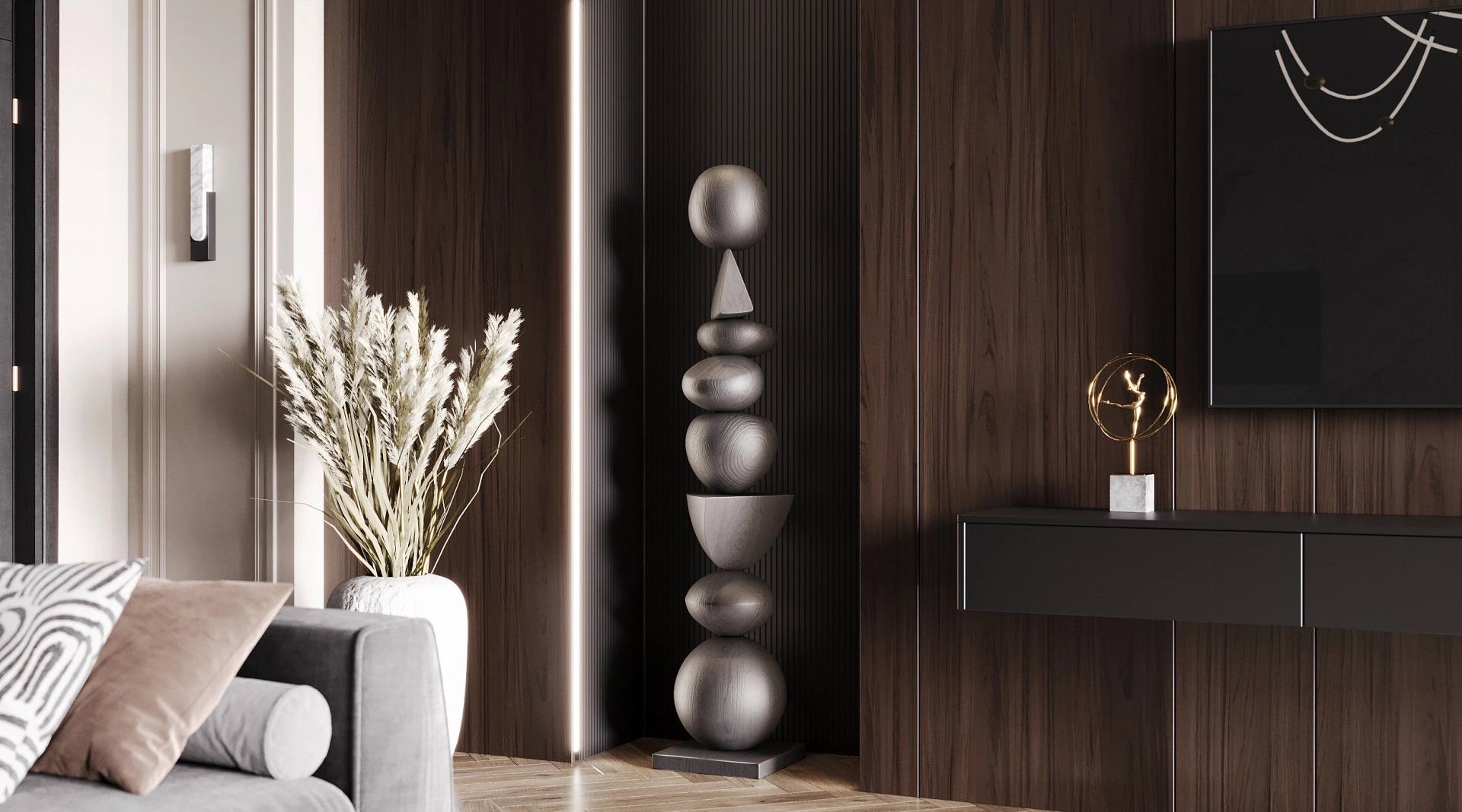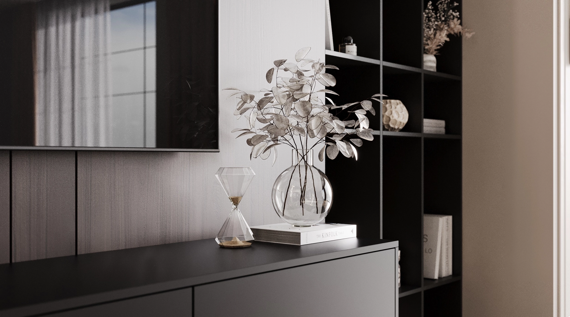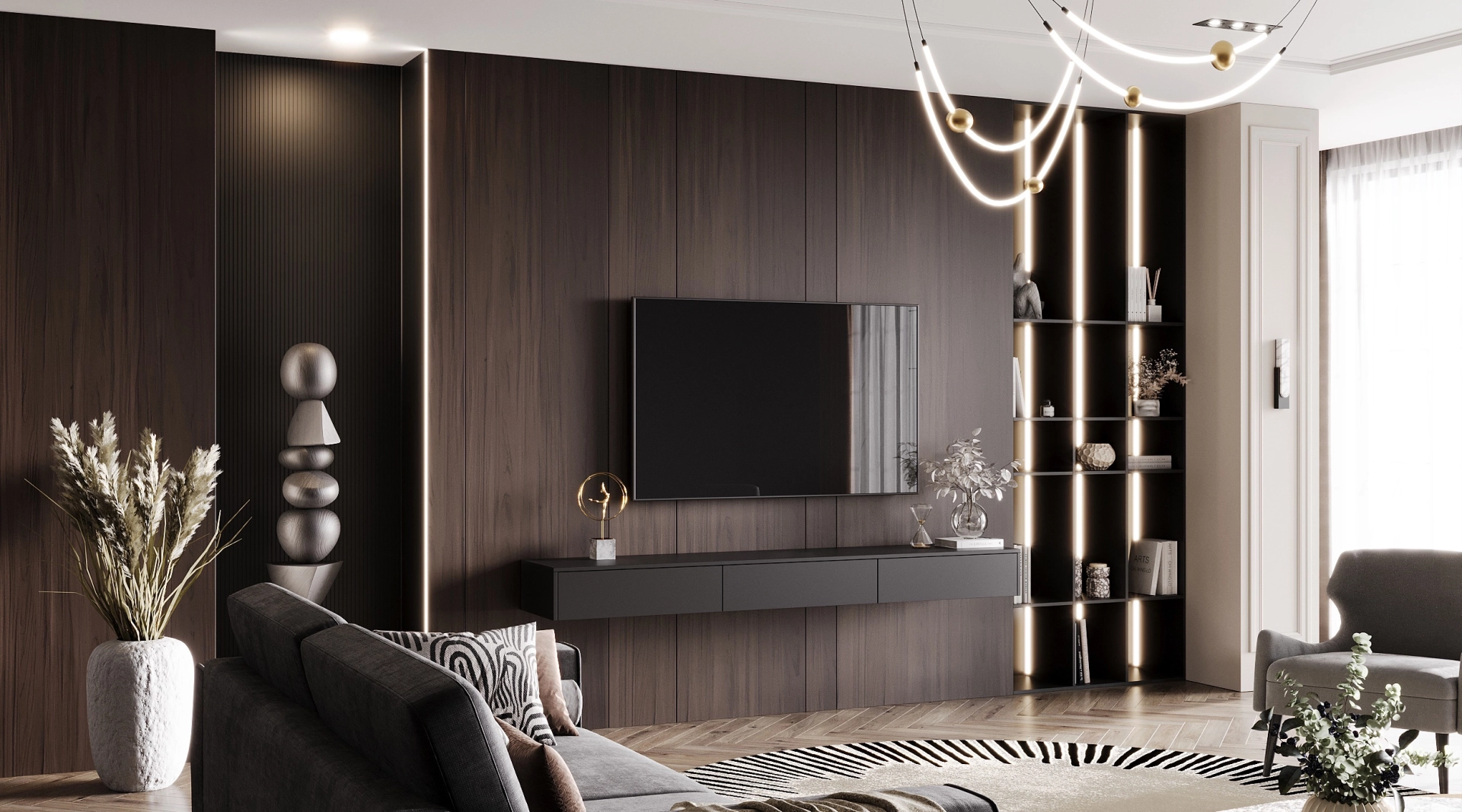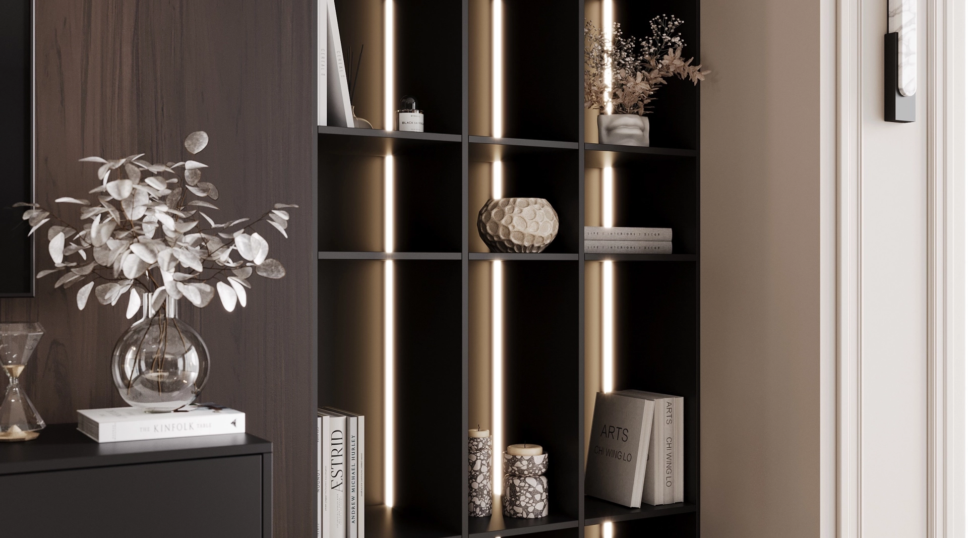 В гостиной Mirelle неоклассика переосмыслена через призму современного восприятия. Открытые секции стеллажа с деликатной подсветкой подчёркивают природную красоту тёмного дерева, усиливая ощущение благородства пространства. Светлые стены мягко оттеняют глубокие тона мебели, создавая сбалансированный контраст, а изысканные декоративные элементы завершают композицию, напоминая о том, что классический интерьер — это искусство внимания к каждой детали.