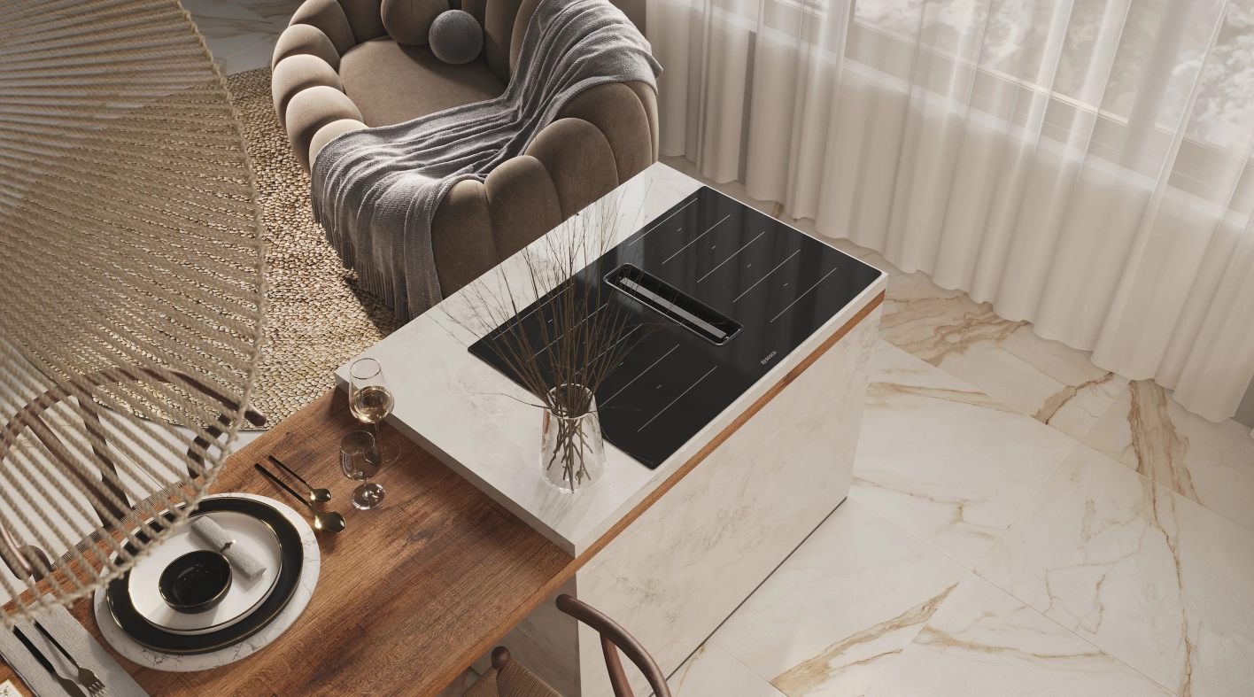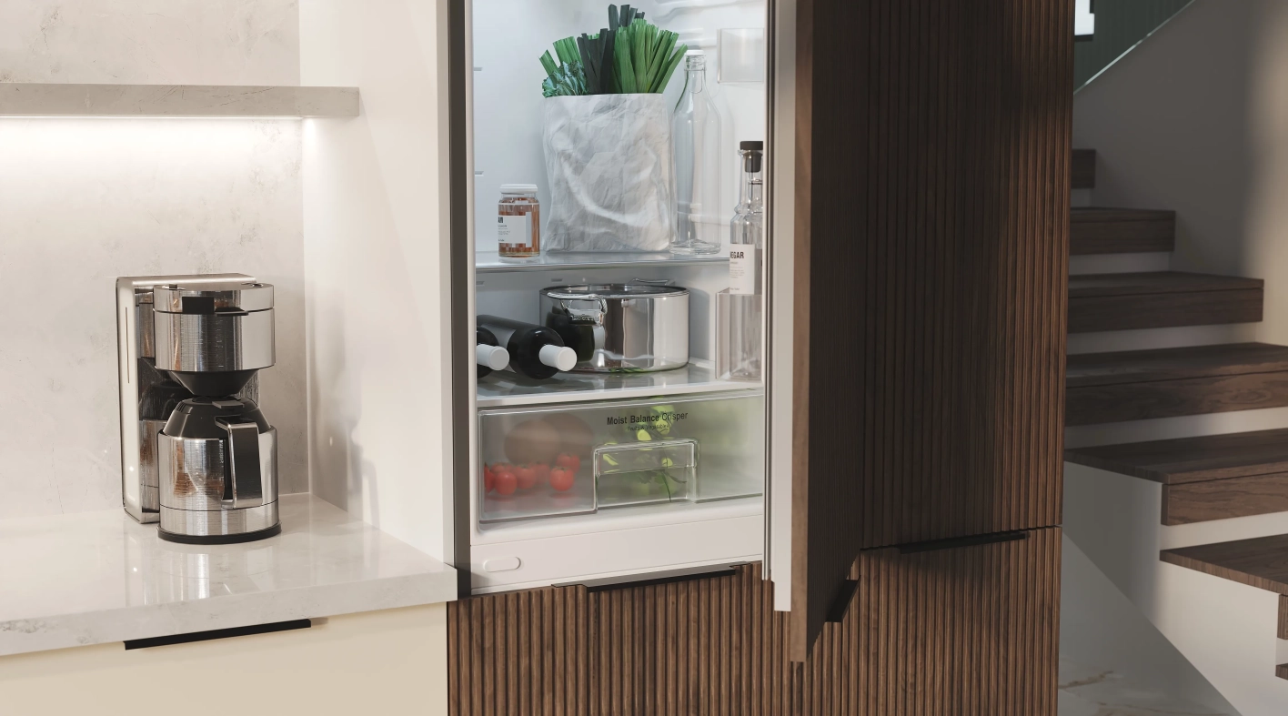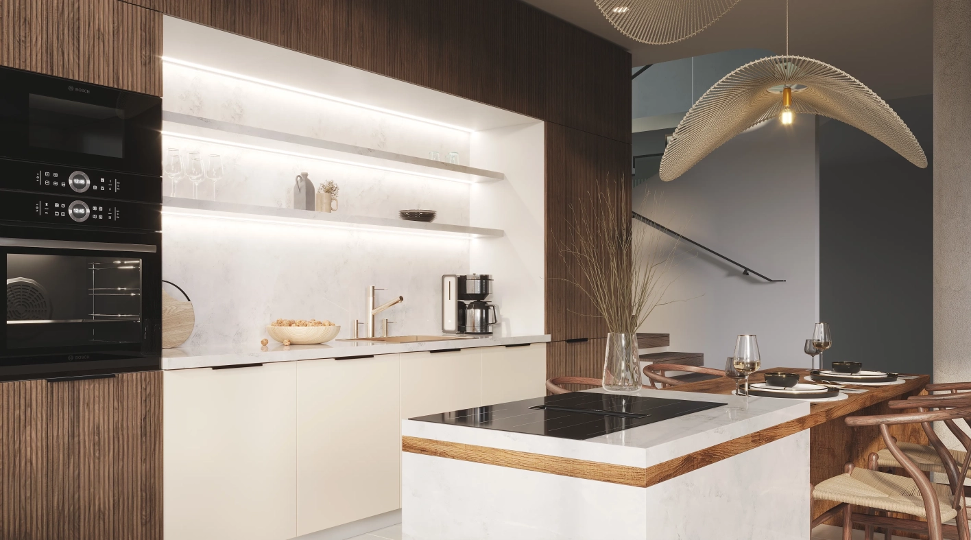 Благородные тёмные фасады с выразительной текстурой дерева и вертикальной фрезеровкой создают атмосферу мощи и устойчивости, словно вековой лес. Светлые фасады и стеновая панель с открытыми полками напоминают лёгкие облака, парящие в вышине, наполняя пространство светом и ощущением свободы. Этот диалог между величием леса и невесомостью неба рождает сбалансированное и гармоничное пространство, в котором природа обретает новое звучание.
