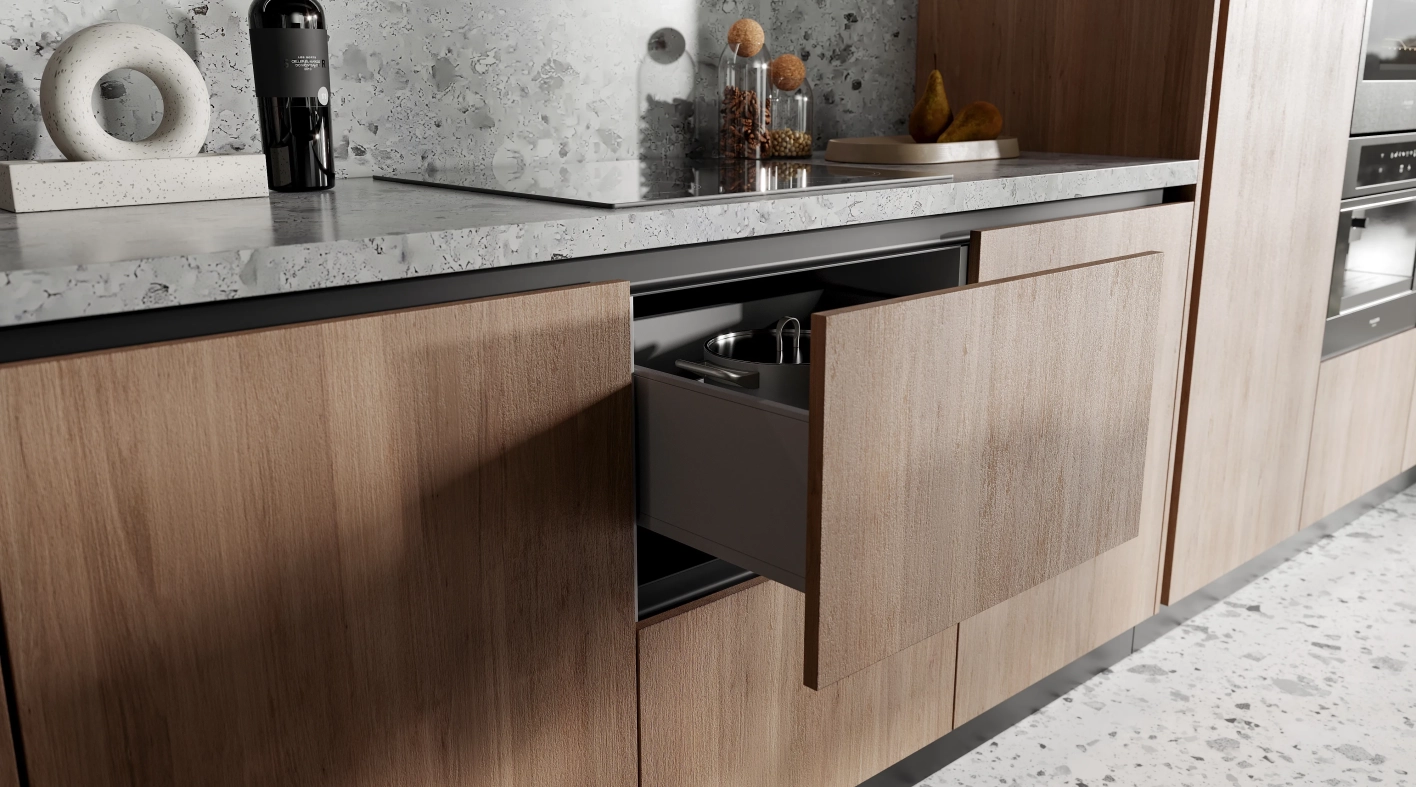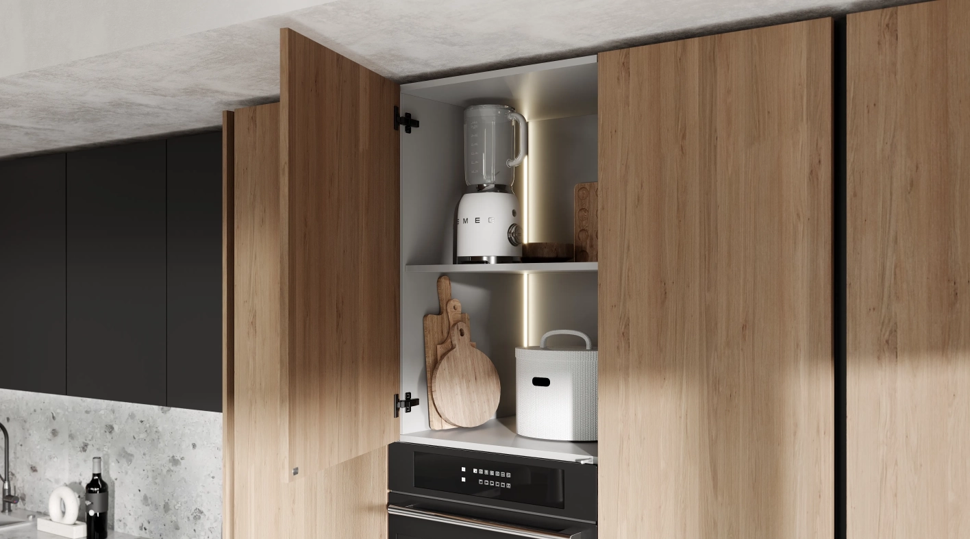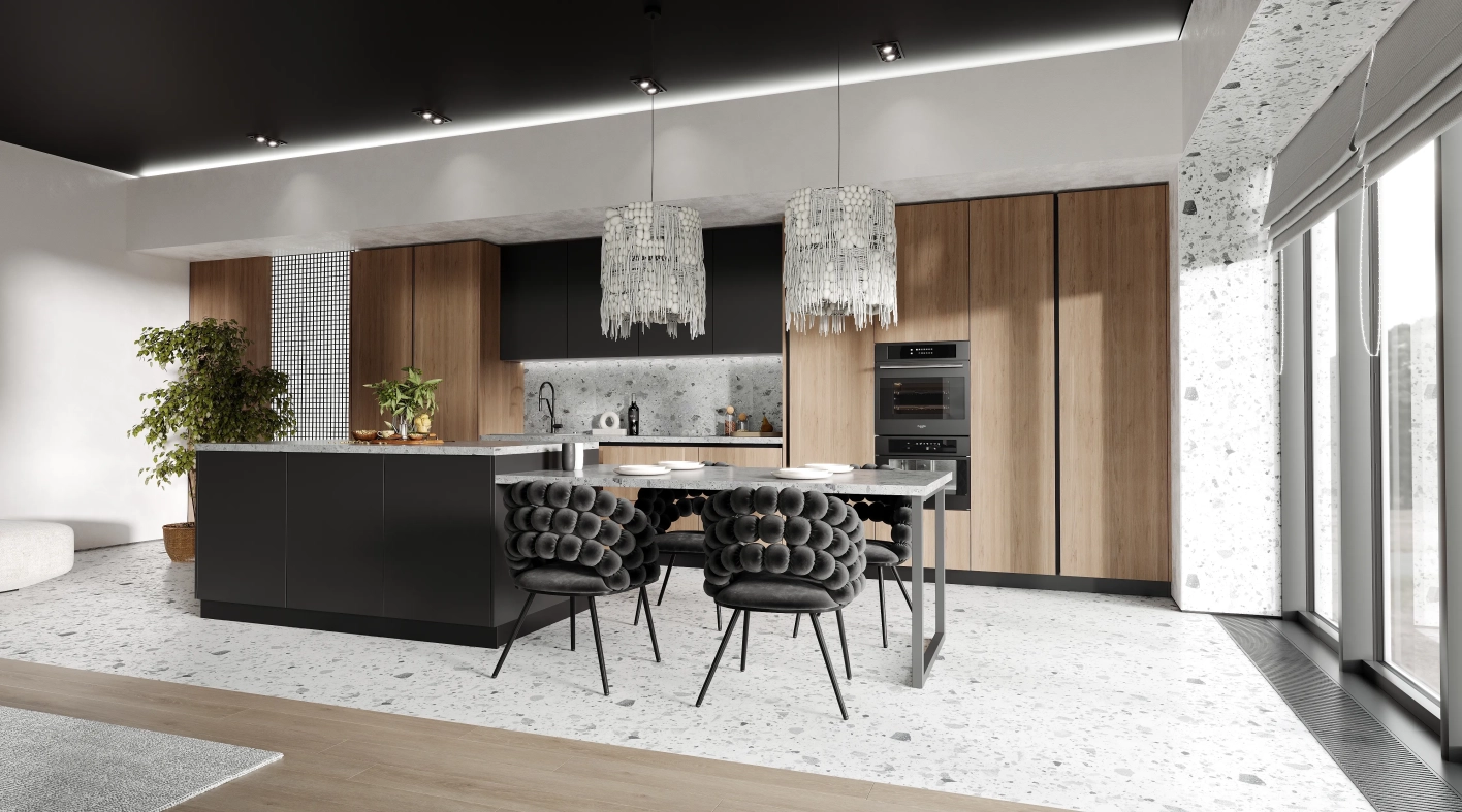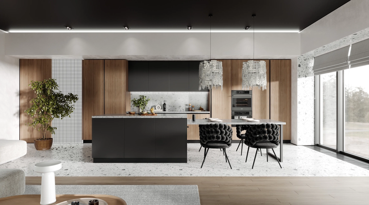 Эта кухня - воплощение гармонии между современным дизайном и естественной красотой природы. Верхние фасады глубокого графитового цвета создают выразительный контраст с текстурой древесины, а остров со столешницей и обеденной зоной под натуральный камень становится композиционным центром пространства. Это выбор тех, кто стремится к осознанному образу жизни и ценит естественную красоту в повседневном окружении. Современный дизайн, вдохновленный мудростью природы.