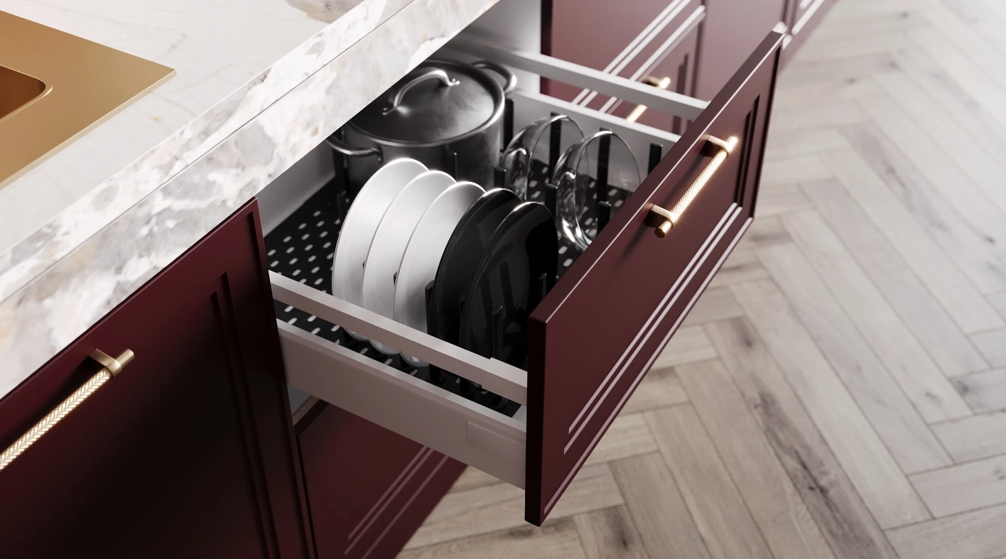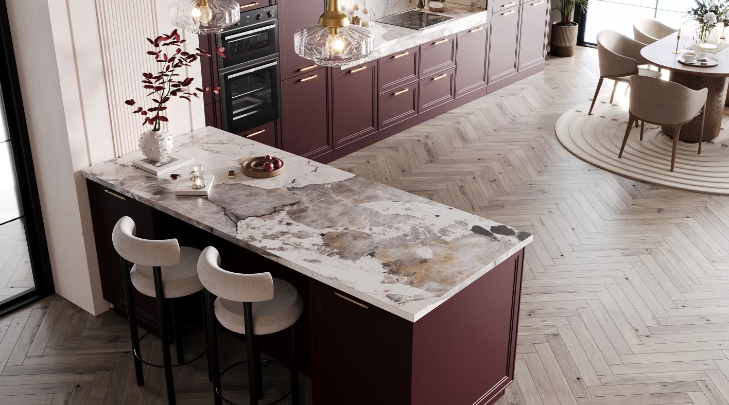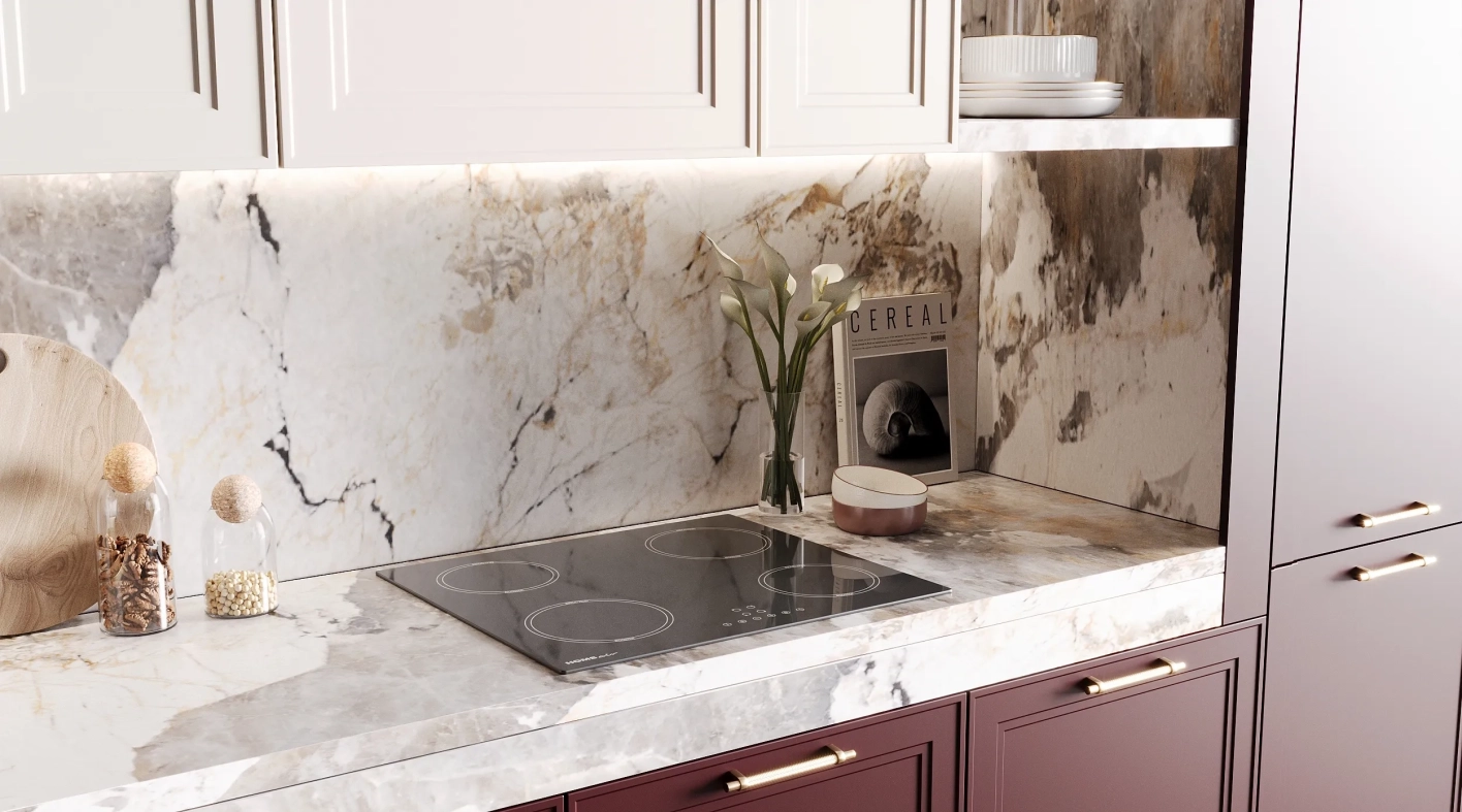 Погрузитесь в мир итальянского искусства, где глубокий оттенок бордо напоминает о спелых виноградных гроздьях Тосканы, а золотые акценты сверкают, как солнечные блики на водах Венецианской лагуны. Фрезерованные фасады с их четкими линиями и мраморные поверхности создают атмосферу утонченной роскоши. Это пространство, где каждая деталь рассказывает историю итальянской красоты, а современные технологии бережно вписаны в классические формы.