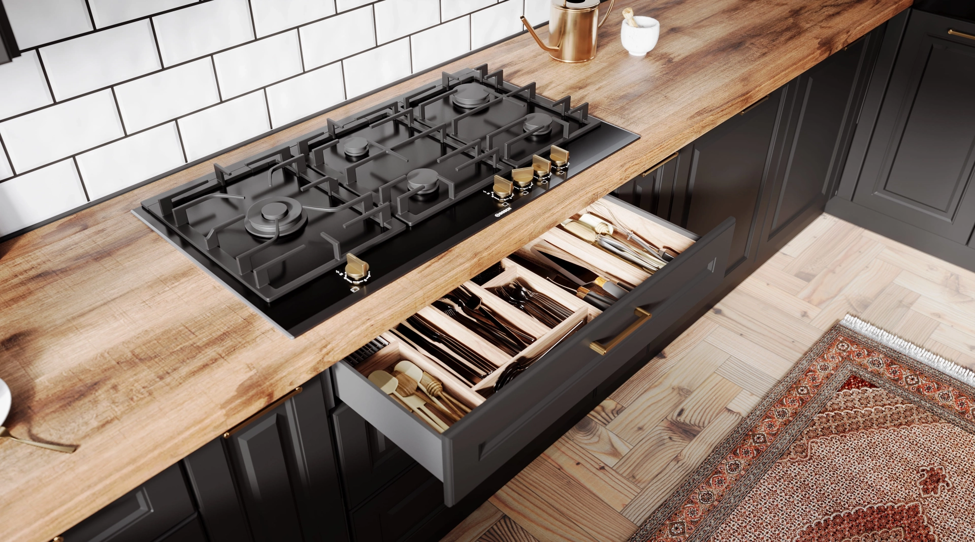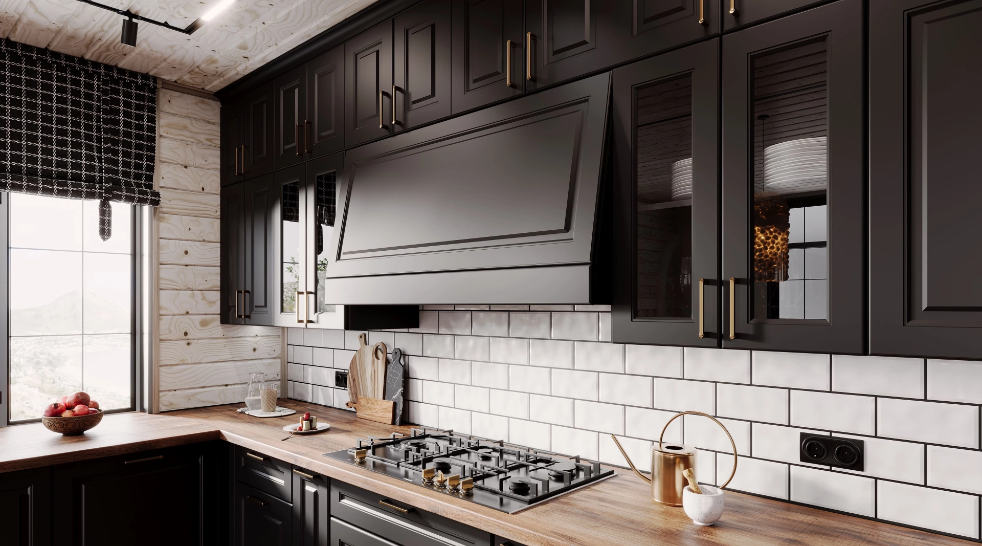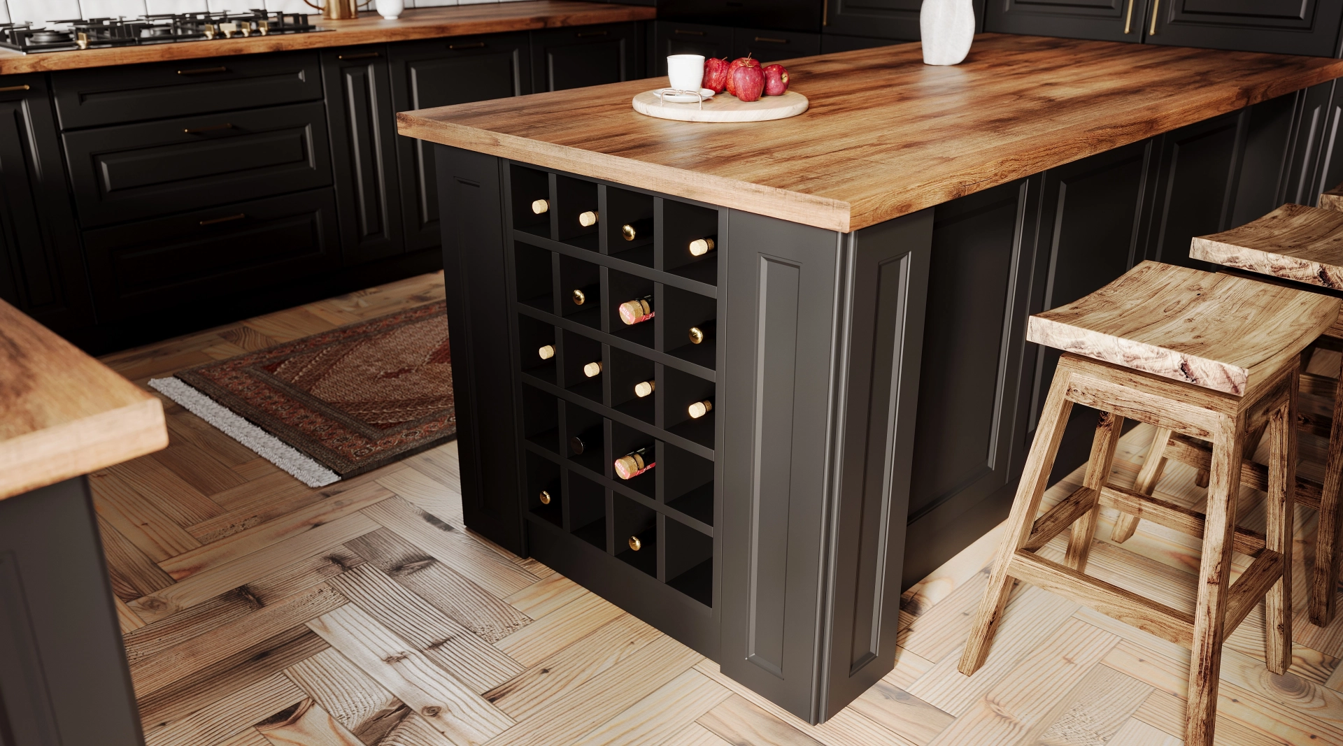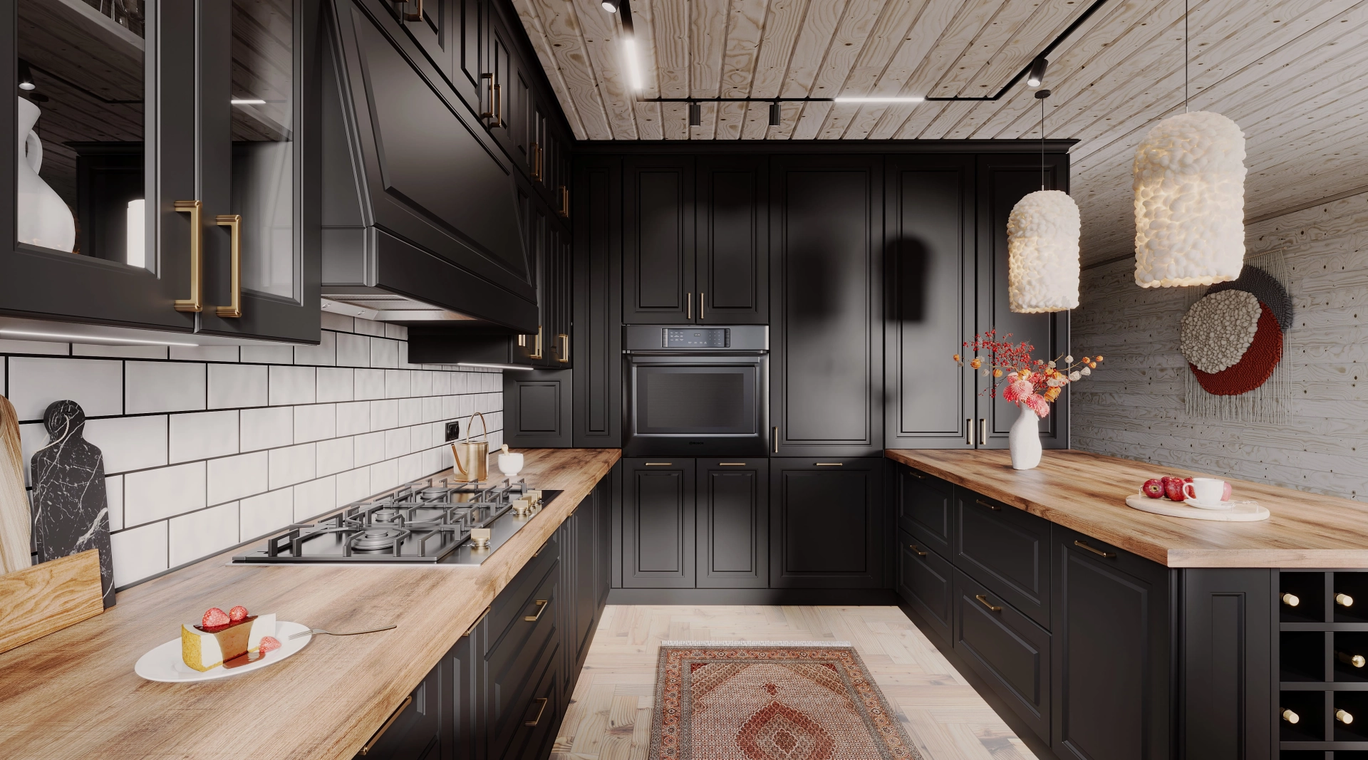 Роскошь черного и естественность дерева рождают уникальную гармонию. Матовые фасады, лишенные лишних деталей, подчеркивают аристократичную сдержанность и строгую элегантность, напоминая интерьеры старинных английских особняков. Остров с деревянной столешницей смягчает строгий облик, создавая уютную атмосферу для семейных обедов и дружеских встреч. Кухня Mistvale подходит для тех, кто ценит статус и безупречный вкус.