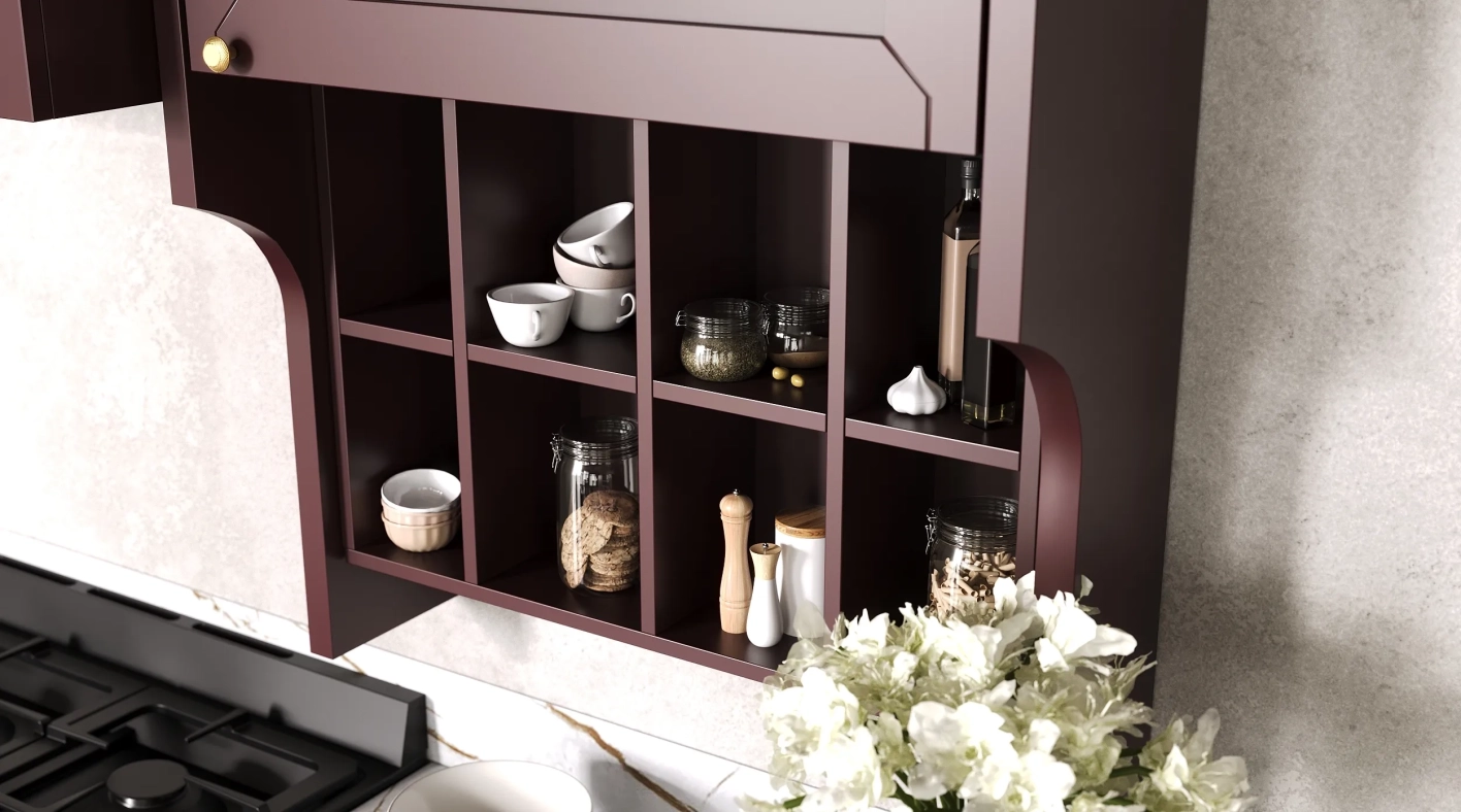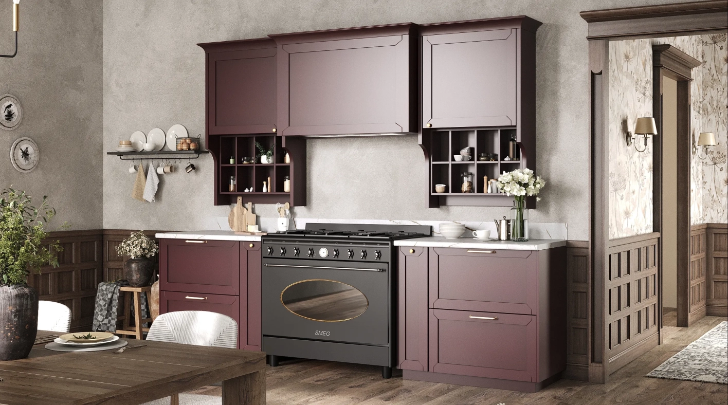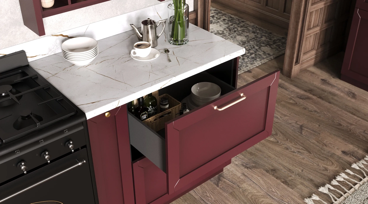 Кухня, где современные технологии служат созданию теплой атмосферы загородного дома. Глубокий цвет бордо на фасадах напоминает о спелых ягодах в саду и благородном вине в бокале. Изящная фрезеровка идеально соответствует эстетике коллекции Village, подчеркивая ее характер. Эта кухня словно перенесена из времен, когда дома располагались вдоль мельниц, а за окнами простирались бескрайние поля.