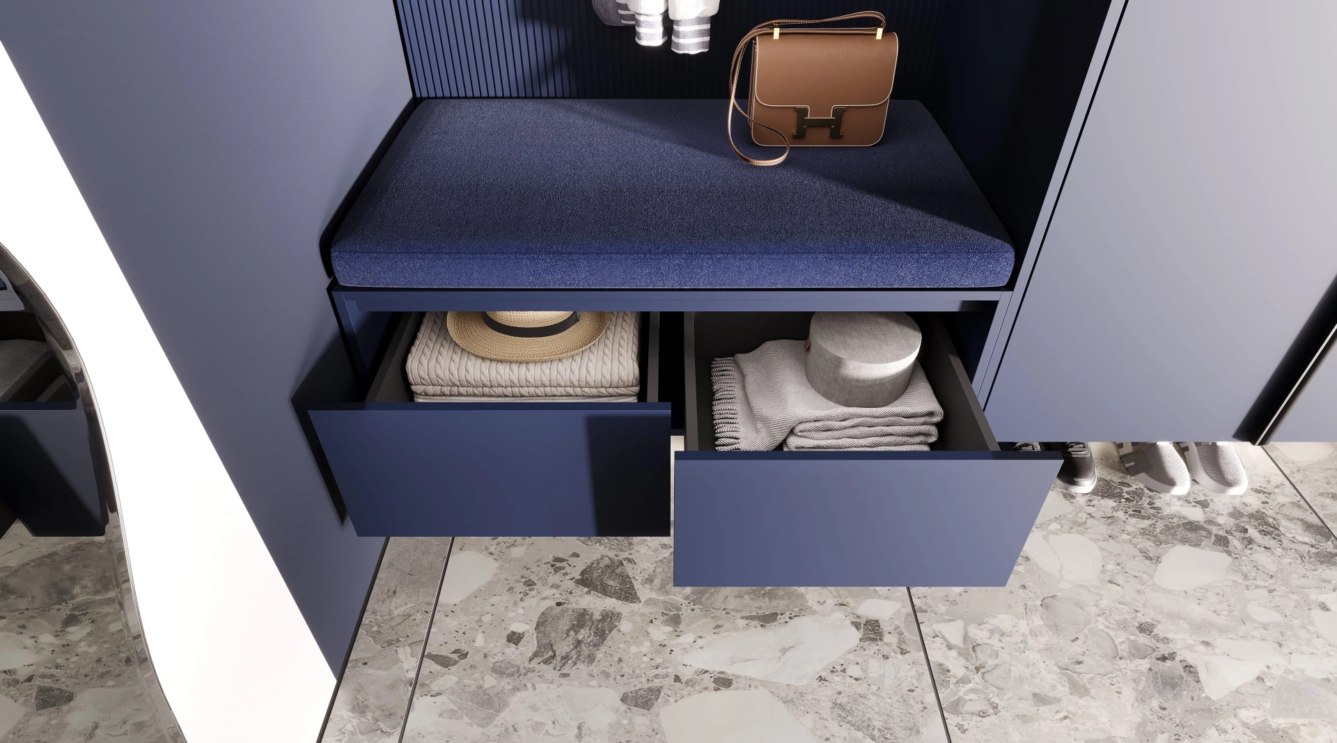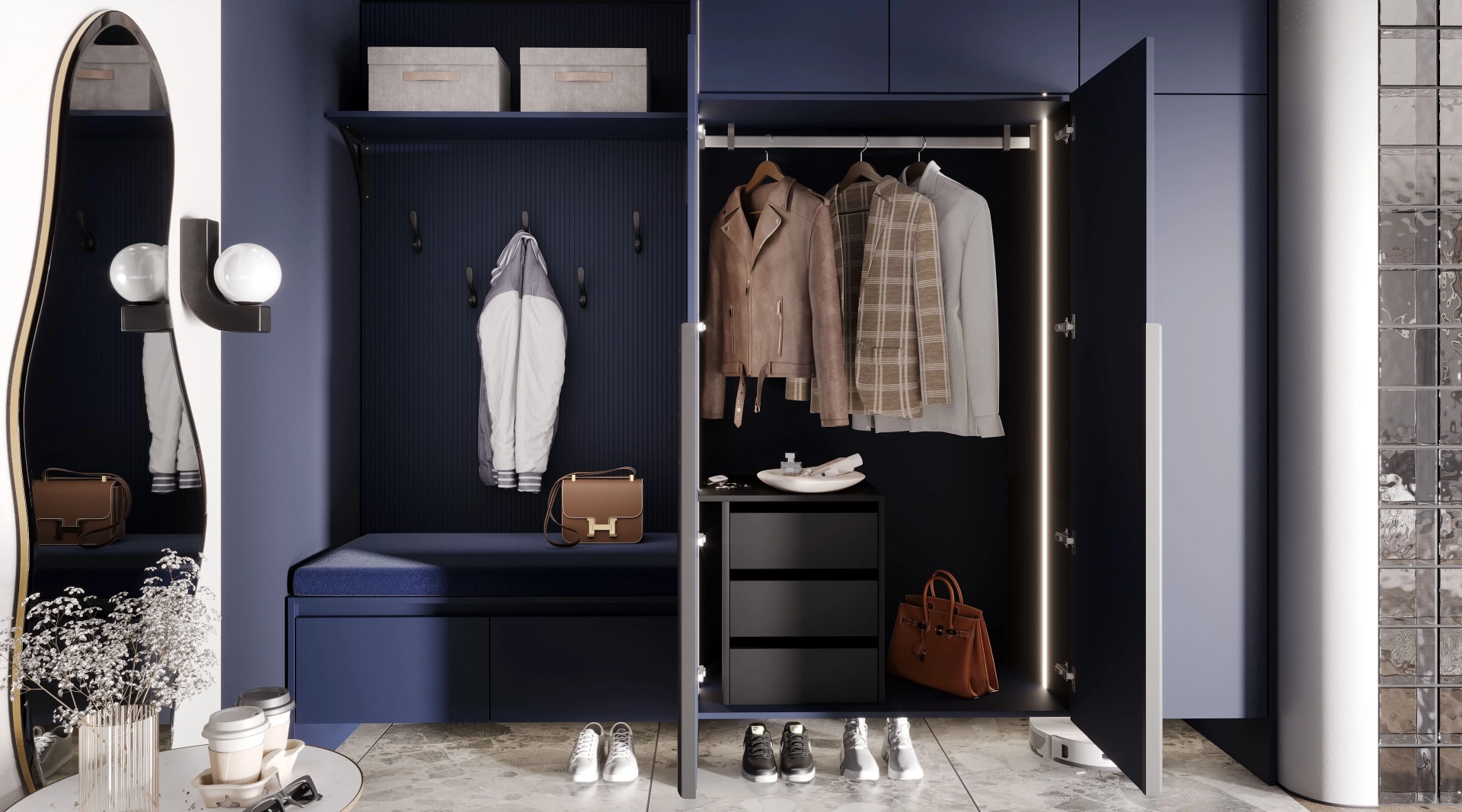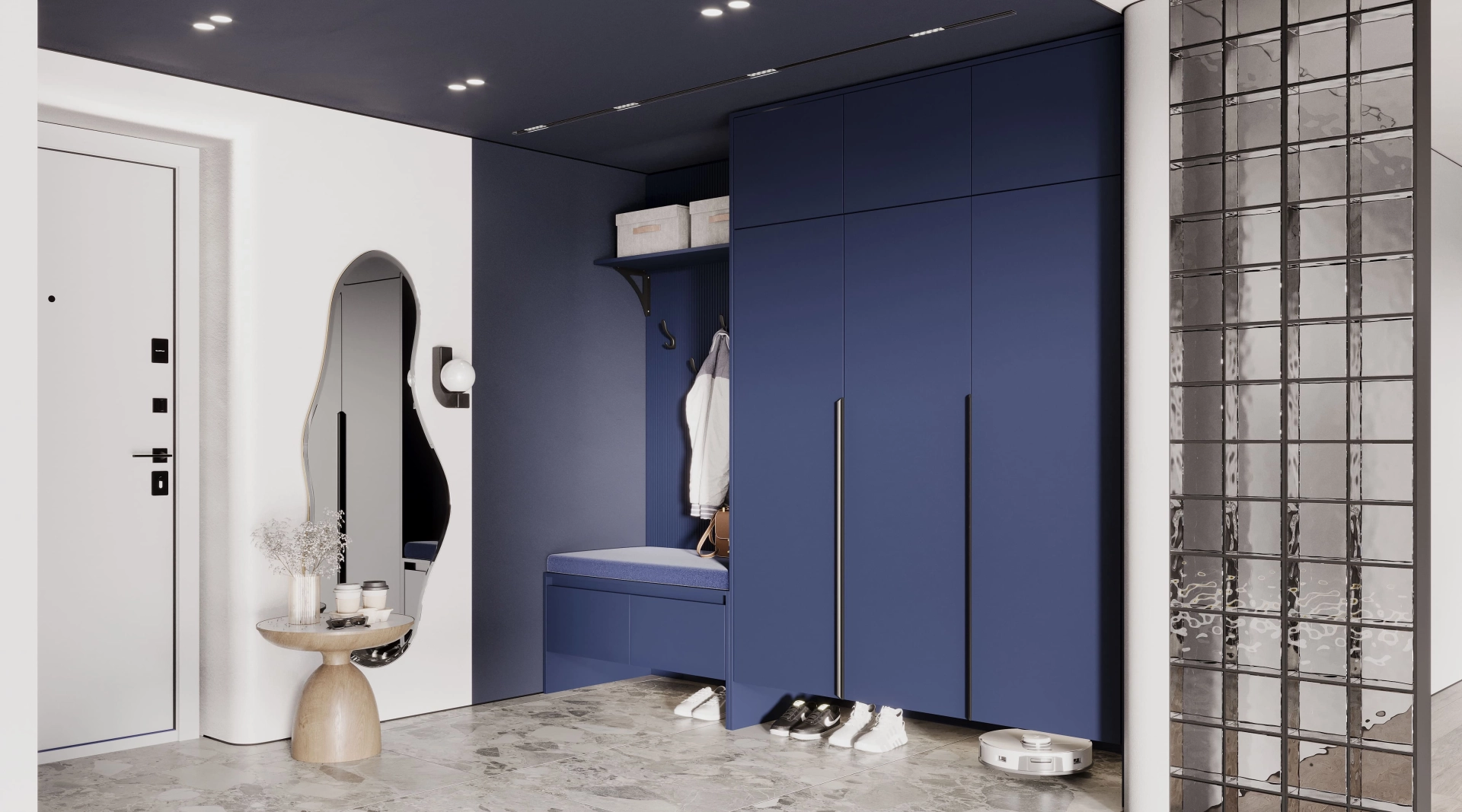 Шкаф глубокого синего цвета охватывает все пространство, выражая эмоции через насыщенный цвет, а его лаконичные фасады и скрытое основание создает ощущение легкости. Стеклянная перегородка, собранная из прозрачных кубов, напоминает хрустальный туман, растворяя границы и играя отражениями. Зеркало в изогнутой форме, вдохновлённое работами Дали, завершает композицию, превращая прихожую в галерею современного дизайна.