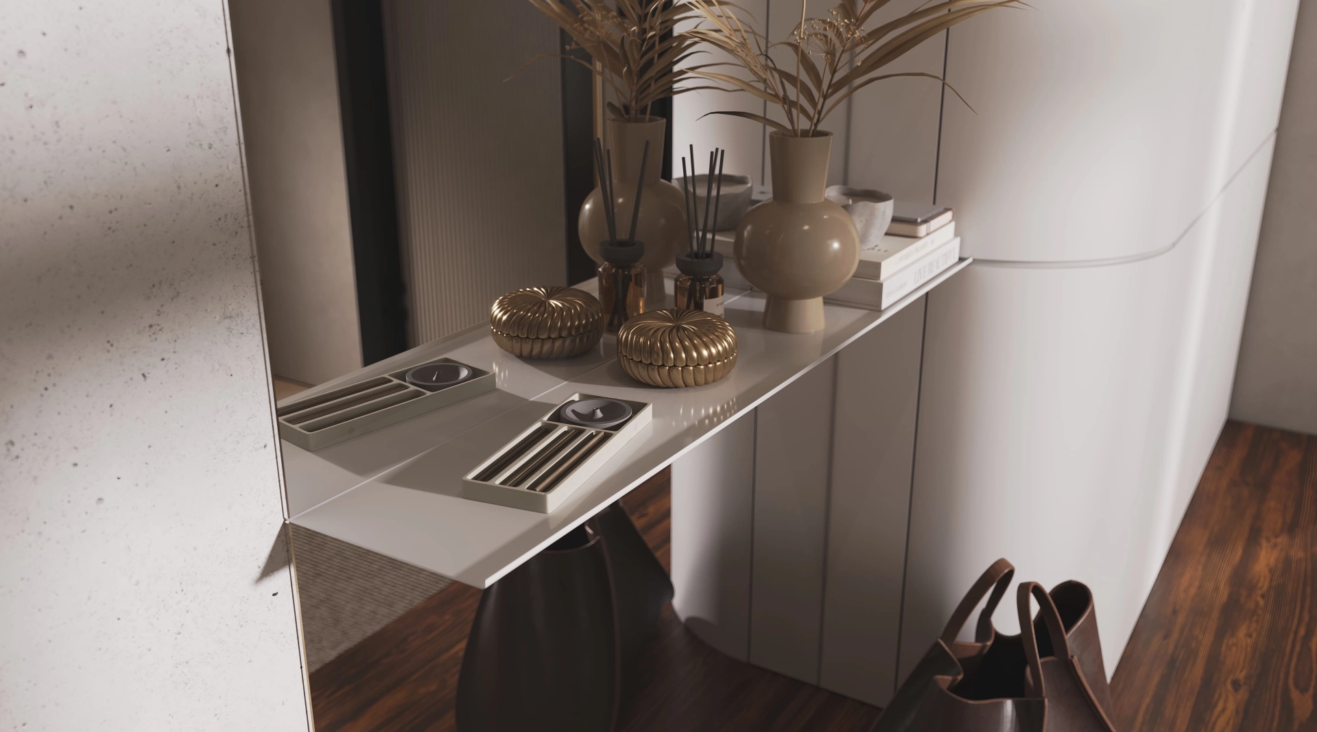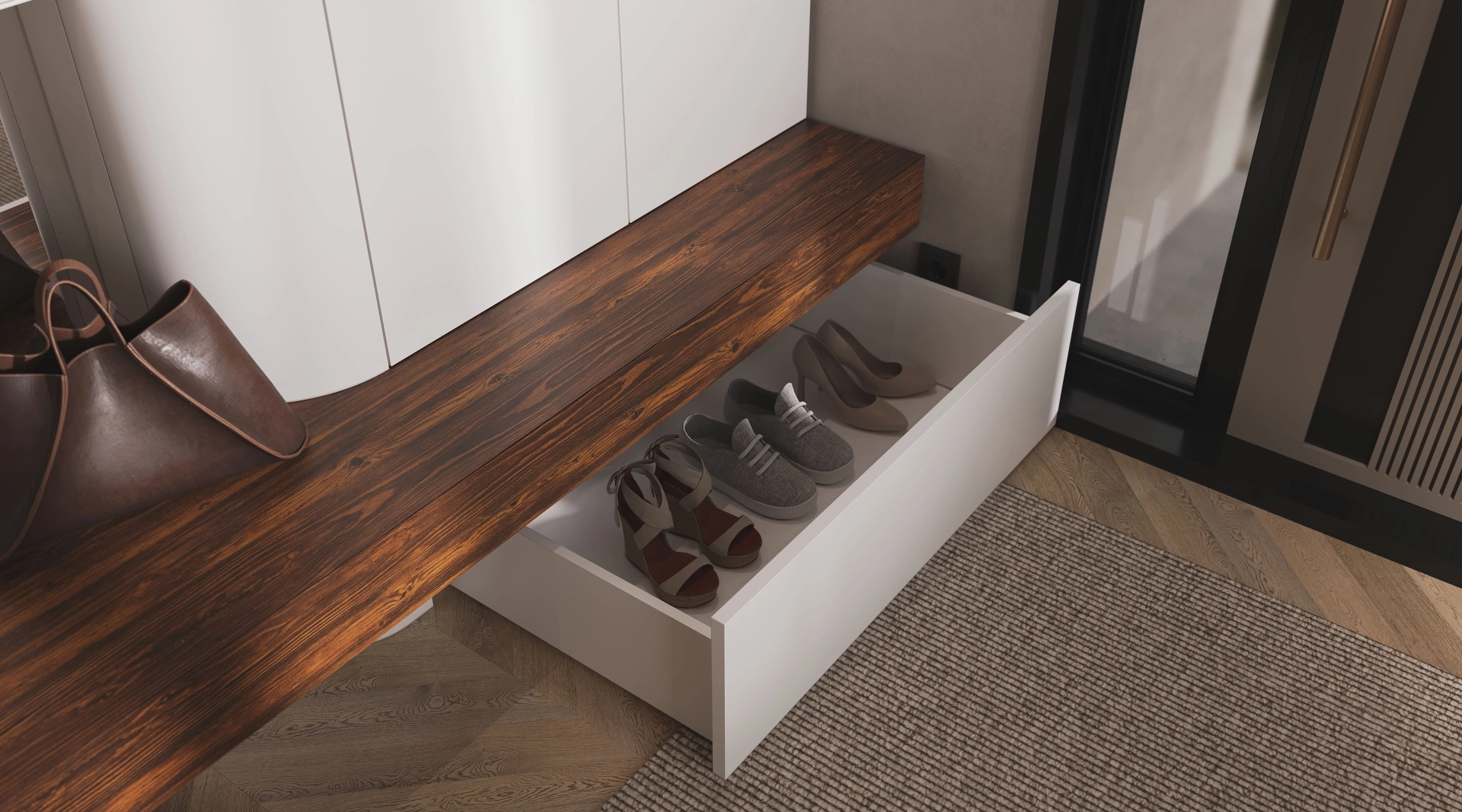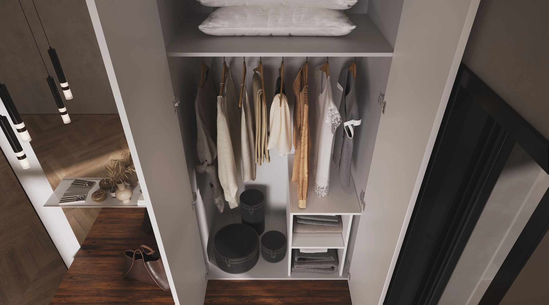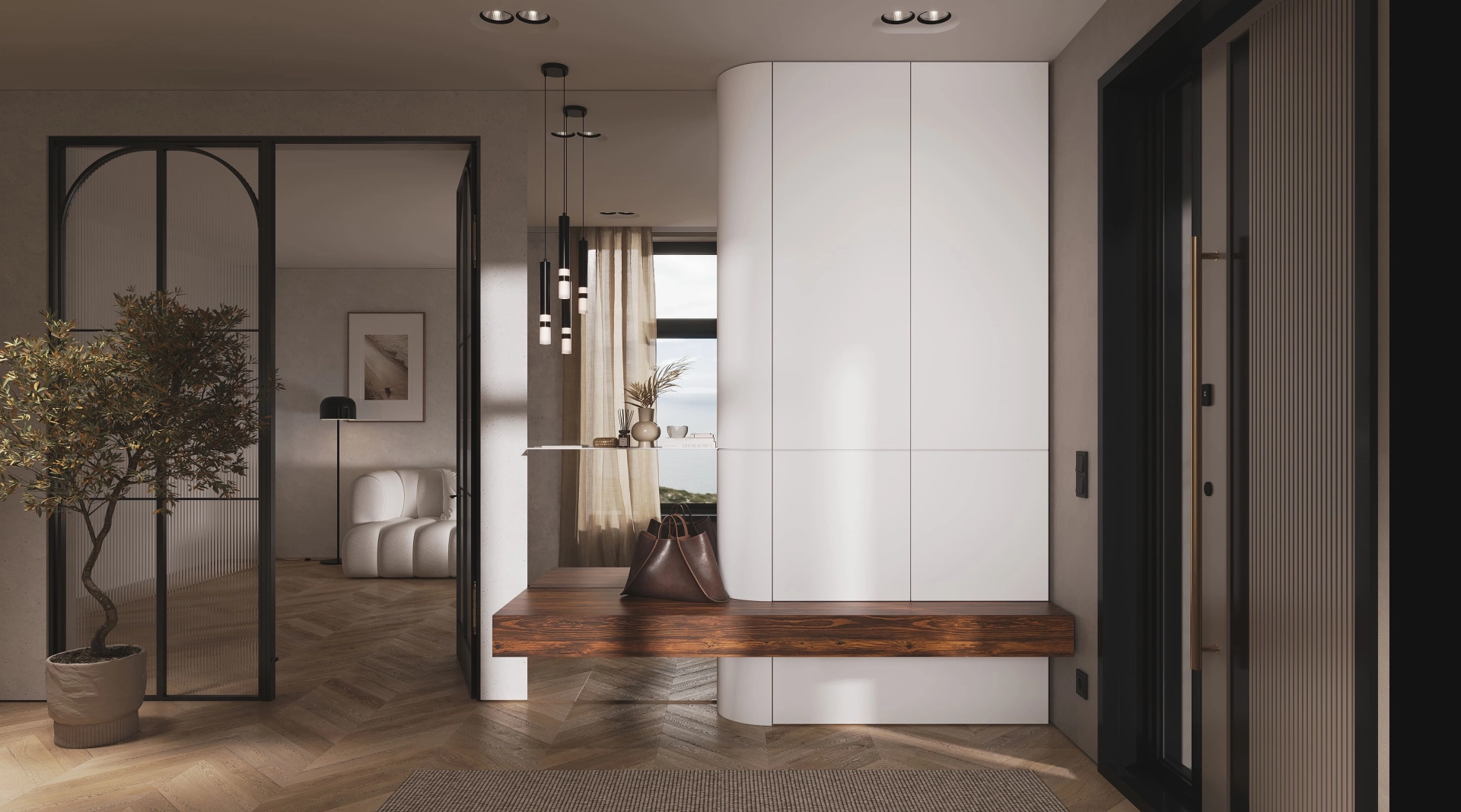 В прихожей Clio рождается балет контрастов. Плавные изгибы светлых фасадов струятся как музыкальная фраза, двигаясь в ритме с четкой геометрией пространства. Контрастную основу композиции задает темное дерево, создавая устойчивый визуальный акцент.