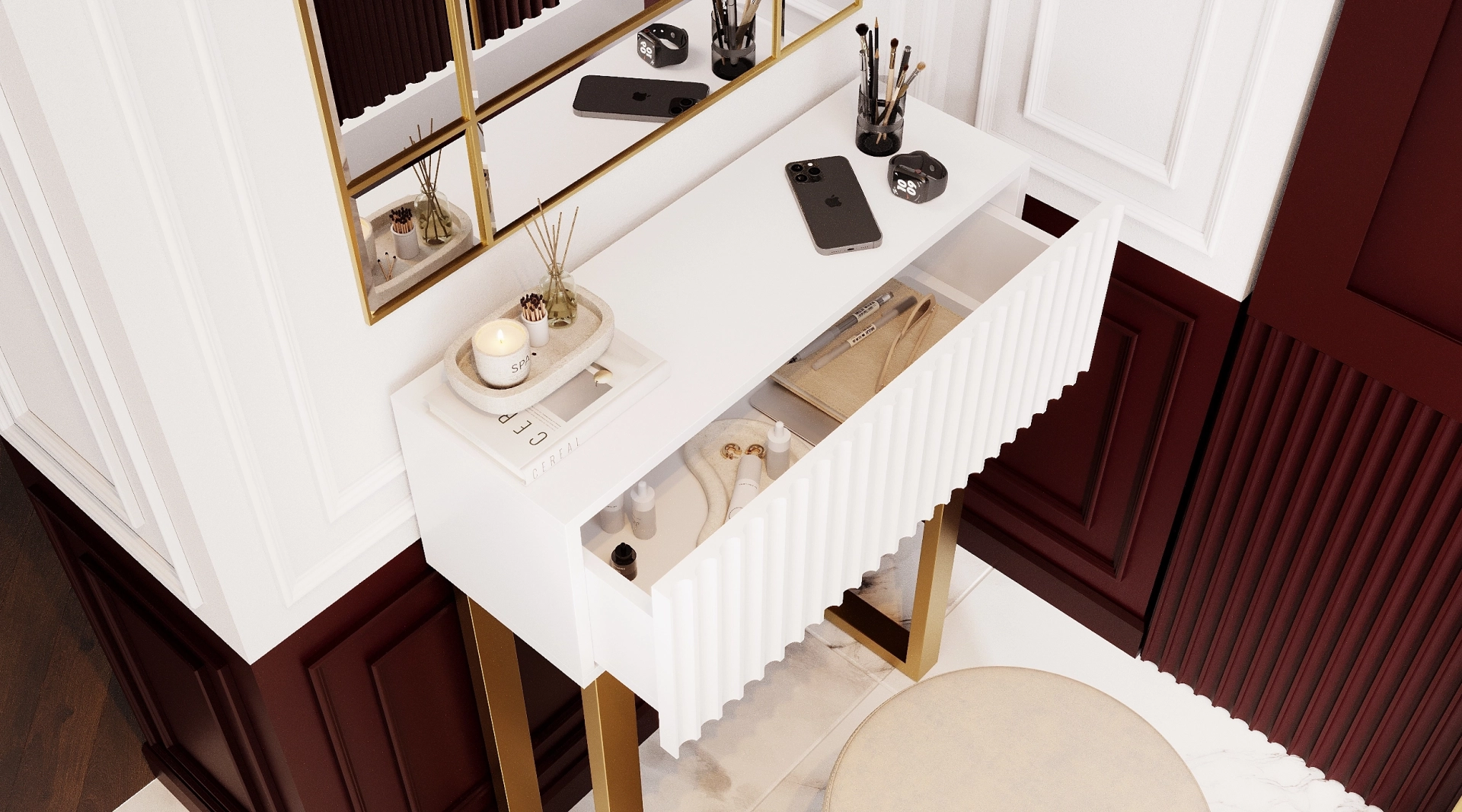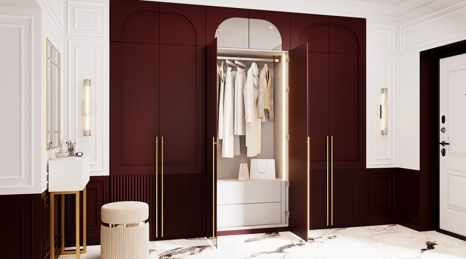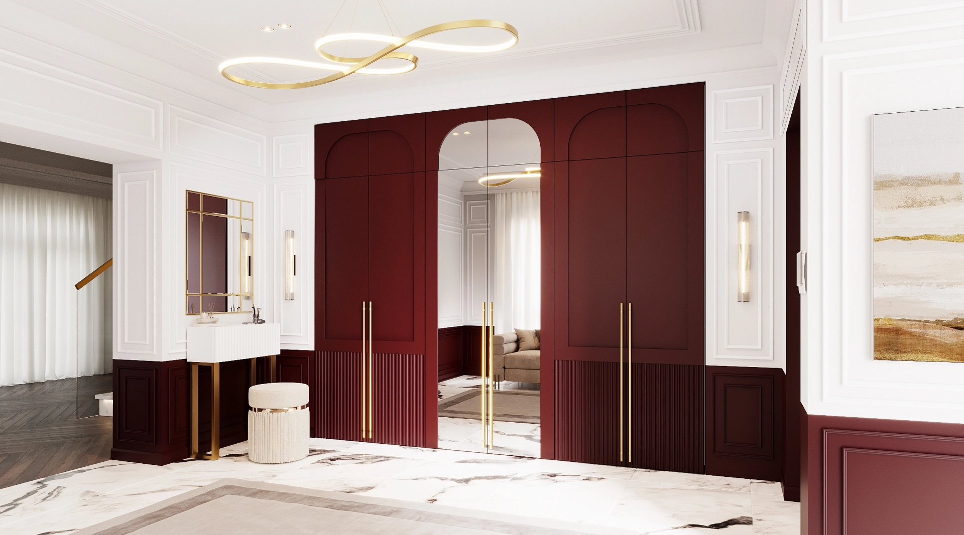 Откройте новый формат роскоши - там, где классические каноны встречаются с современной эстетикой. Винно-белая палитра задает тон, создавая глубину и благородство. Напольное покрытие из белого мрамора с выразительными прожилками становится художественным фундаментом пространства, а зеркальные фасады шкафа визуально расширяют границы, наполняя интерьер светом и воздухом.