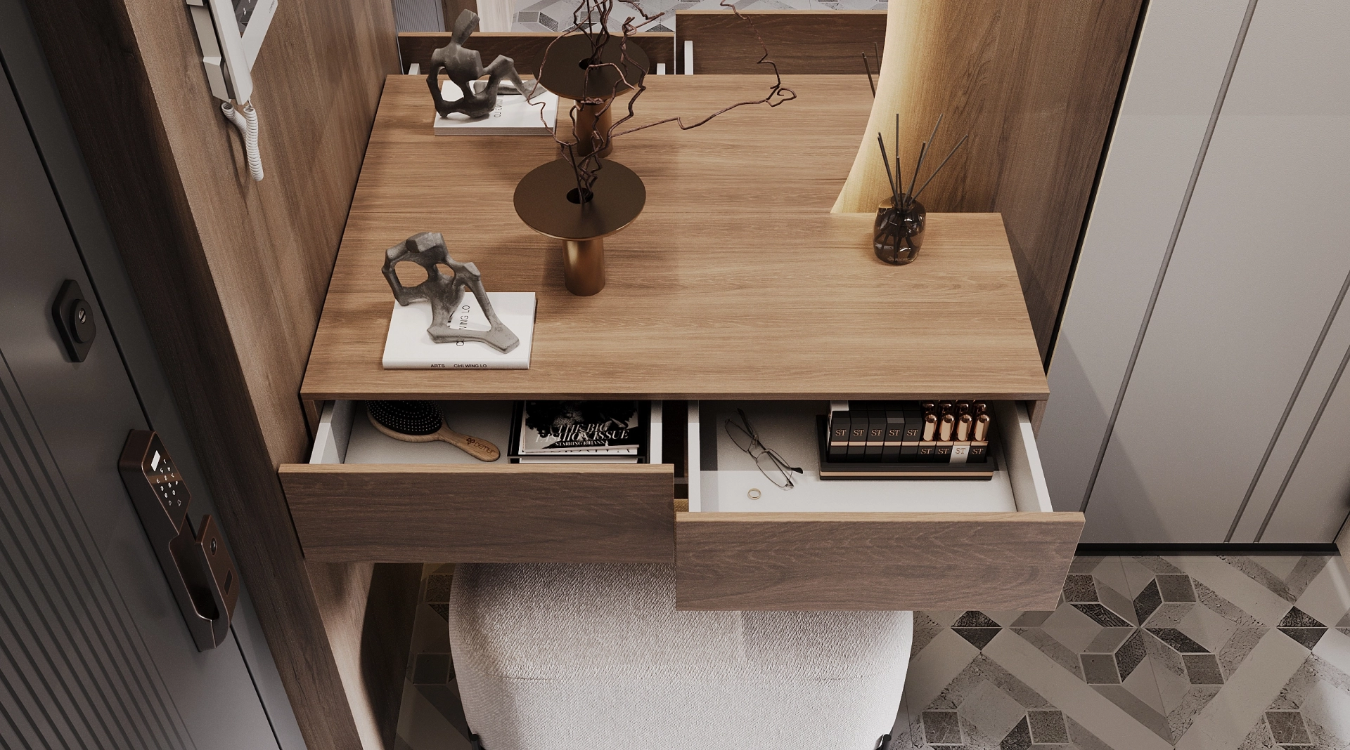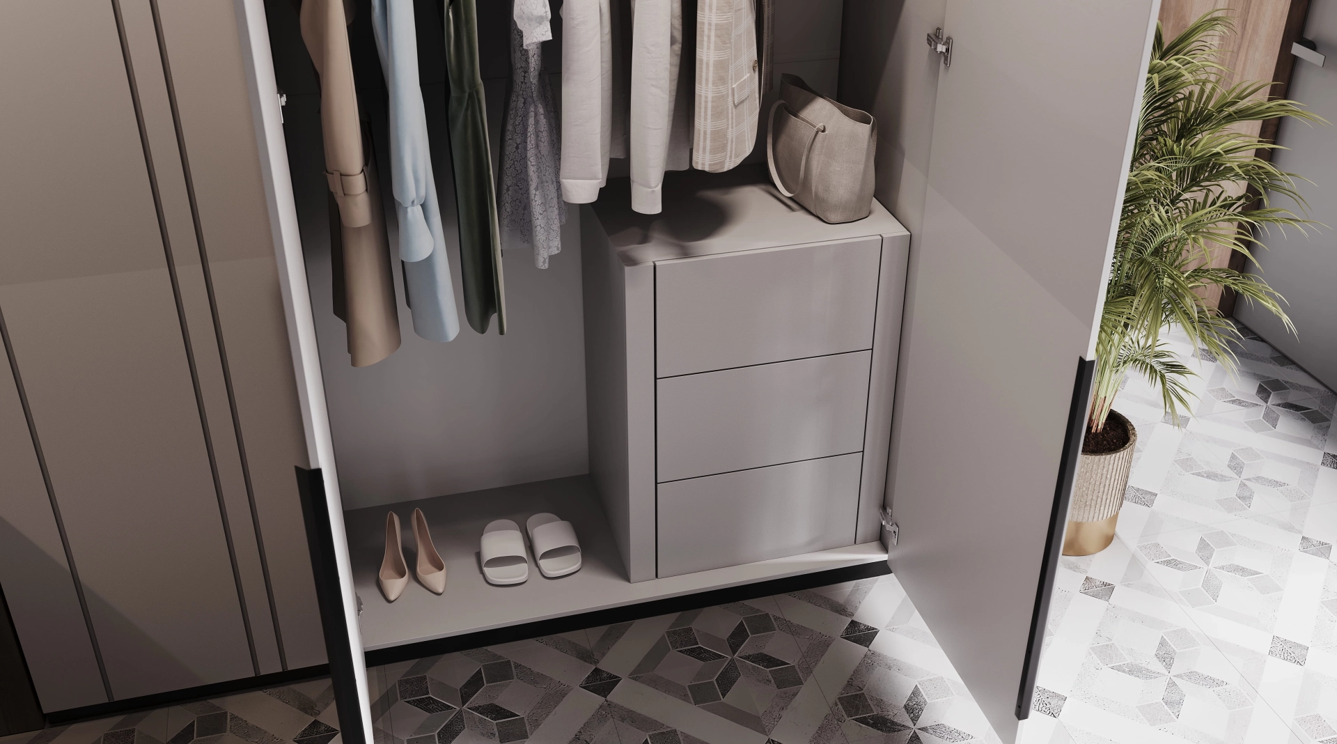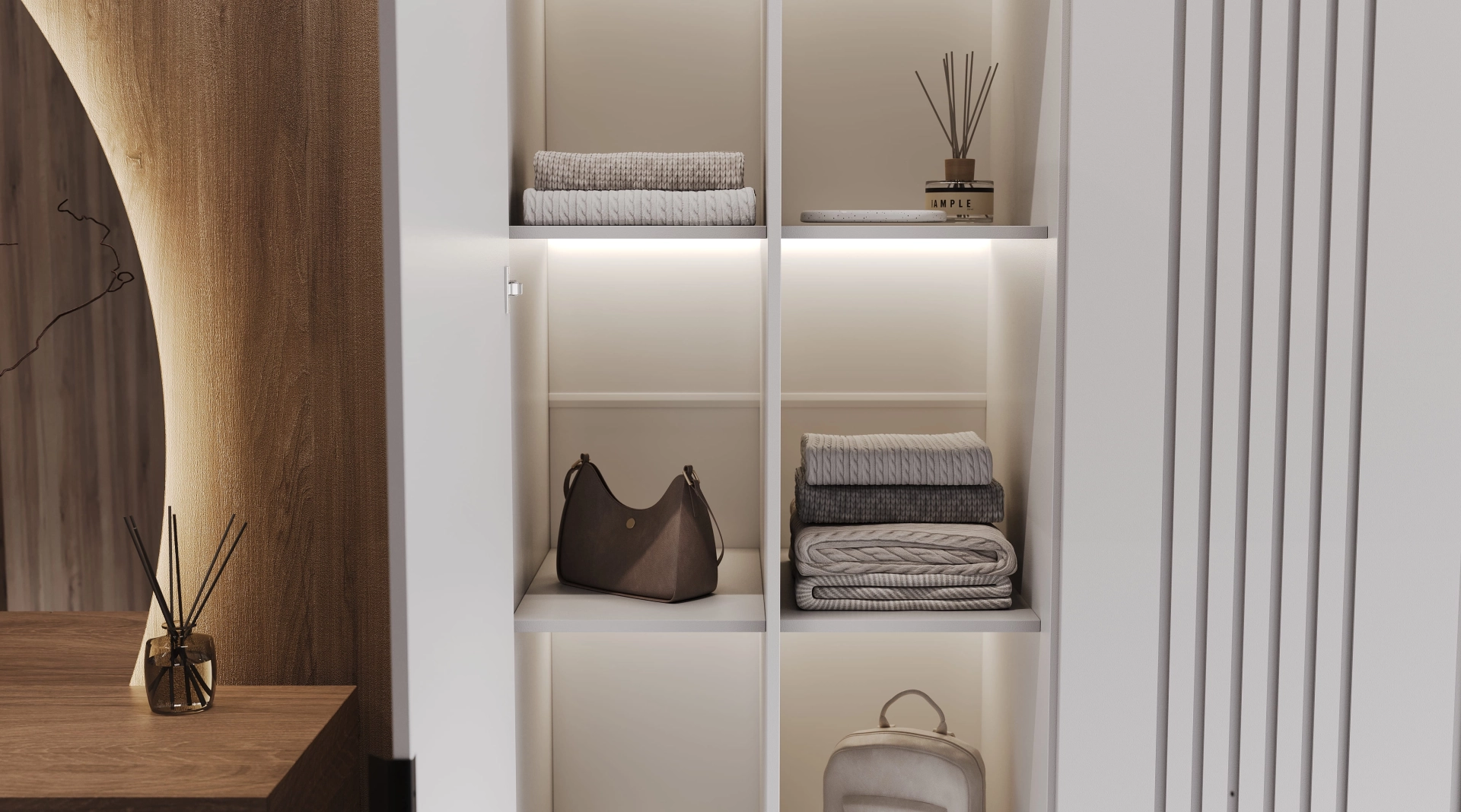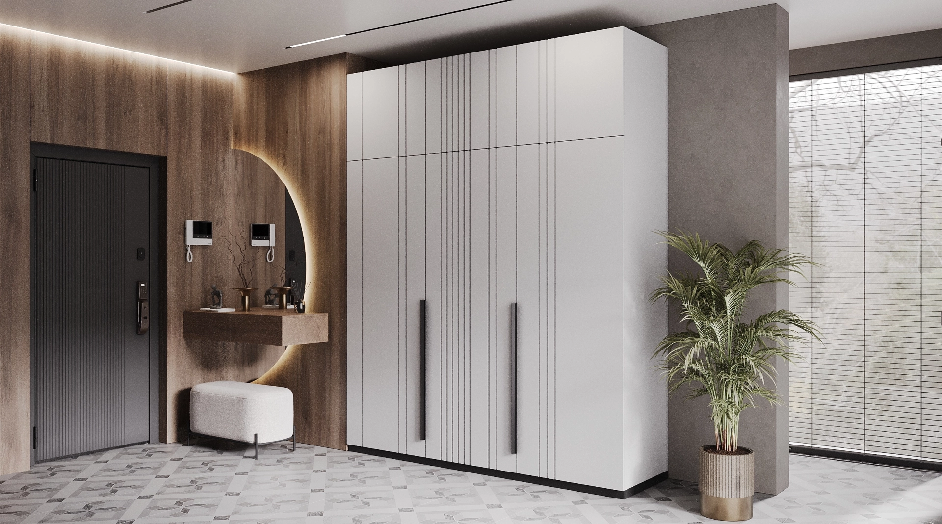 Прихожая Timberlight - это место, где встречаются два мира. Четкие, лаконичные линии современного мегаполиса обретают душу благодаря мягкому дыханию природы. Монолитный белый шкаф становится олицетворением урбанистической ясности. Его ценность не в декоративности, а в чистоте идеи: ничего лишнего, только форма и функция. Тепло в это пространство привносит текстура дерева, которая служит выразительным контрастом гладким белым фасадам.