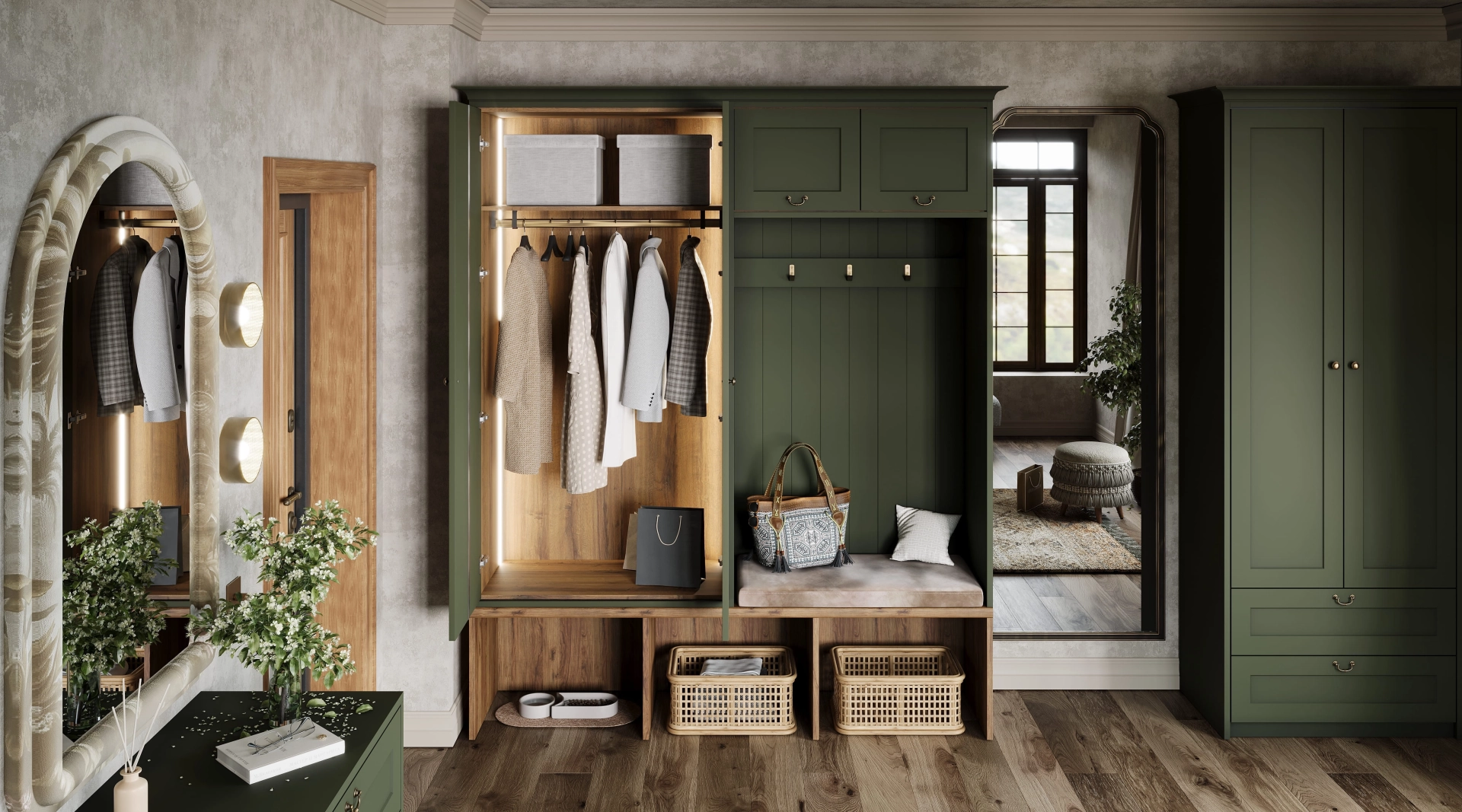 Представьте прихожую, которая пахнет свежеструганным деревом и летним утром. Зеленый шкаф цвета сочной травы, с открытыми полками, где удобно расставлены корзинки для мелочей, а внизу - кормушка для вашего питомца, потому что комфорт должен быть для всех. Это место, где хочется оставить спешку за порогом и насладиться спокойствием.