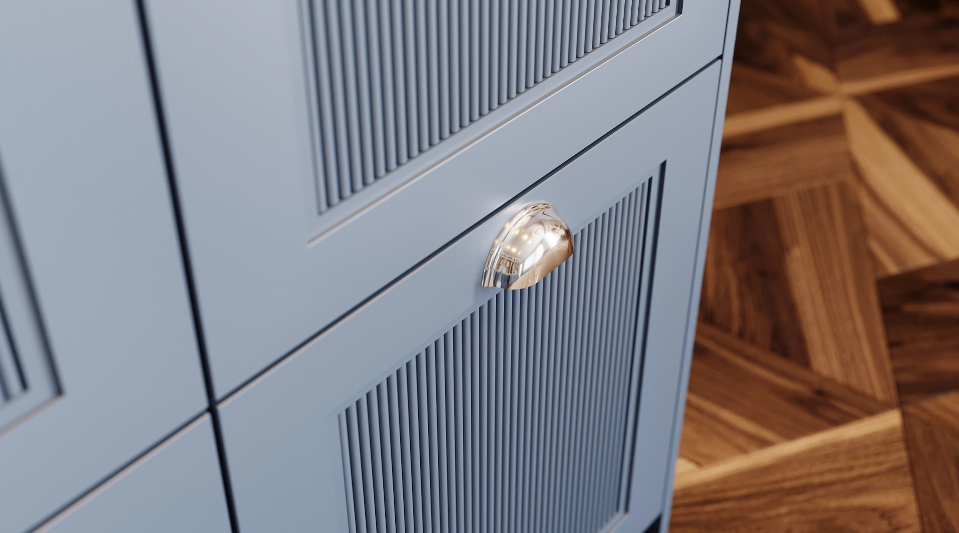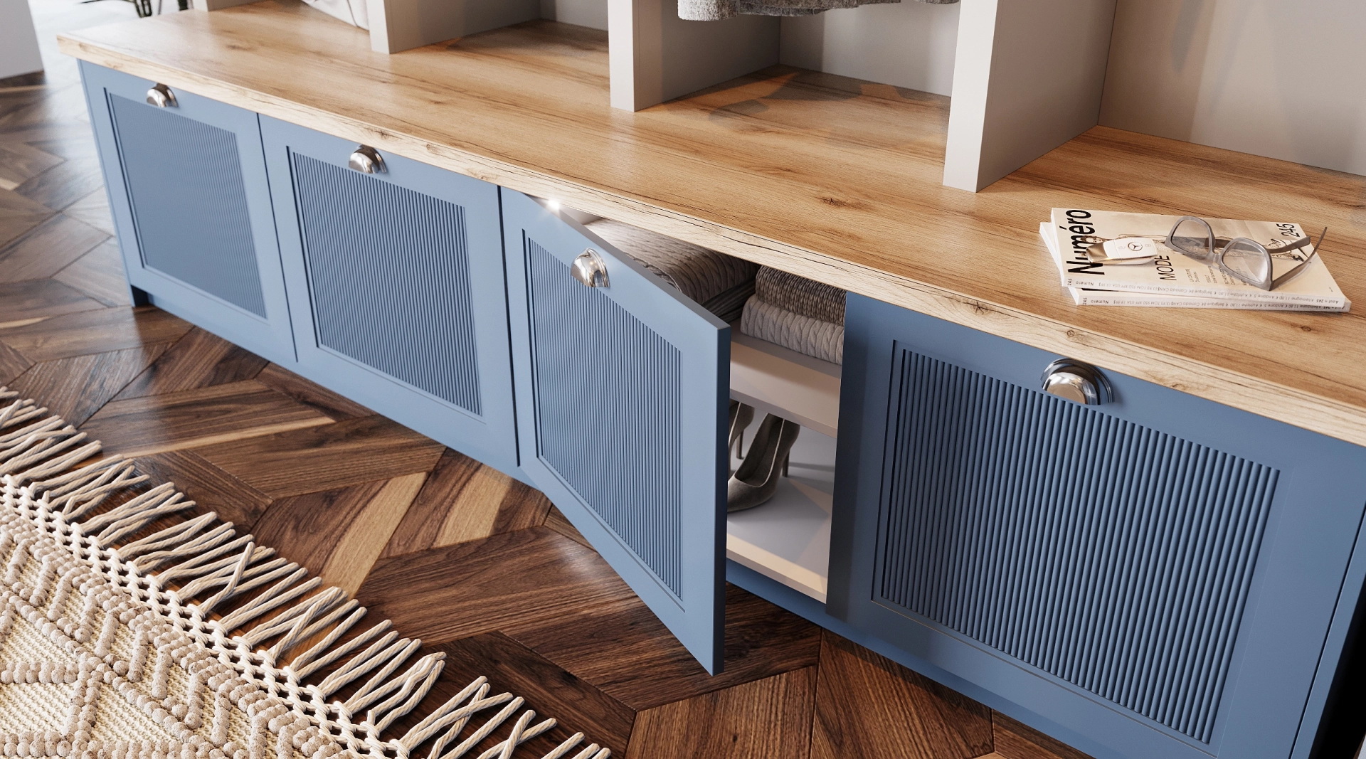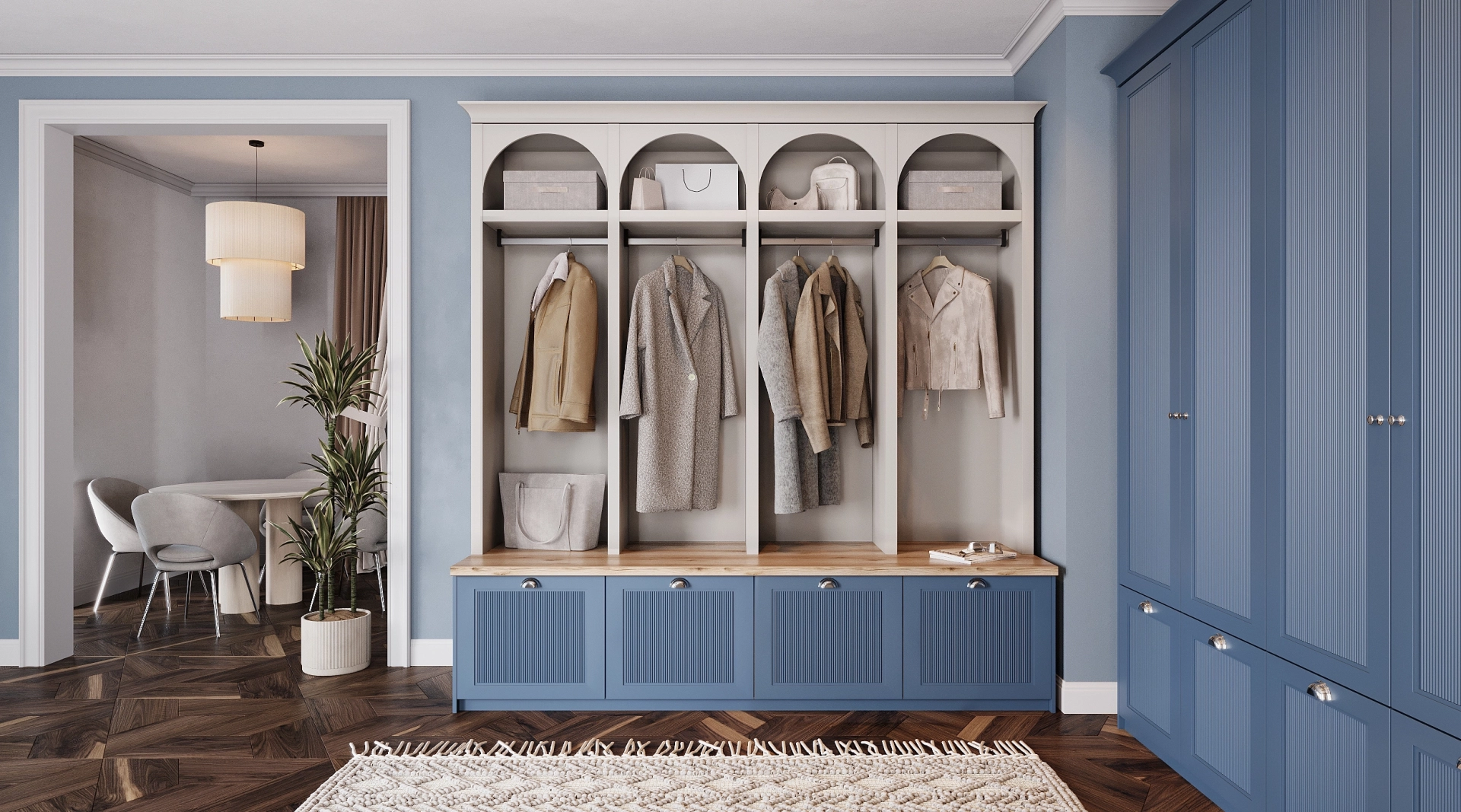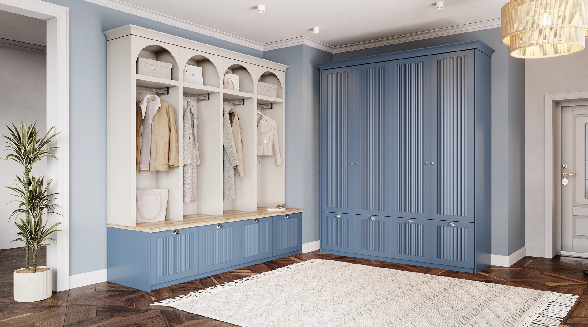 Светло-голубые фасады шкафа задают лёгкое настроение всей прихожей. Фрезерованные рифлёные поверхности играют со светом, создавая живую игру бликов, а изящные полукруглые арки добавляют воздушности. Минимализм и обилие естественного света подчеркивают уют и простоту загородной эстетики. Здесь каждая деталь - от натурального дерева до ковра с этническим узором - все говорит о неспешном ритме жизни и единении с природой.
