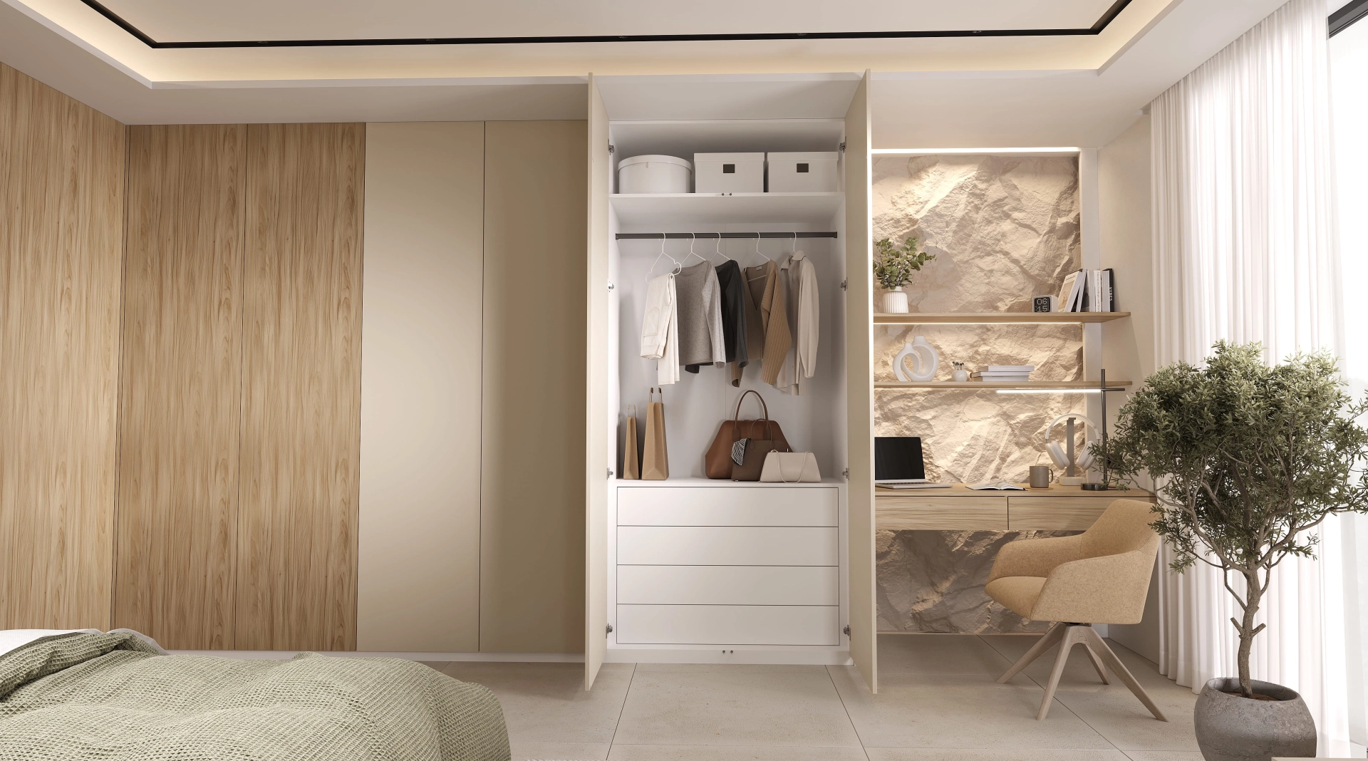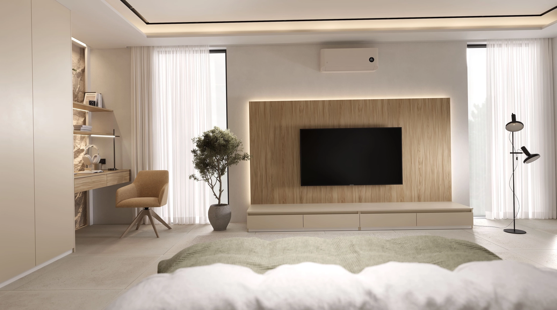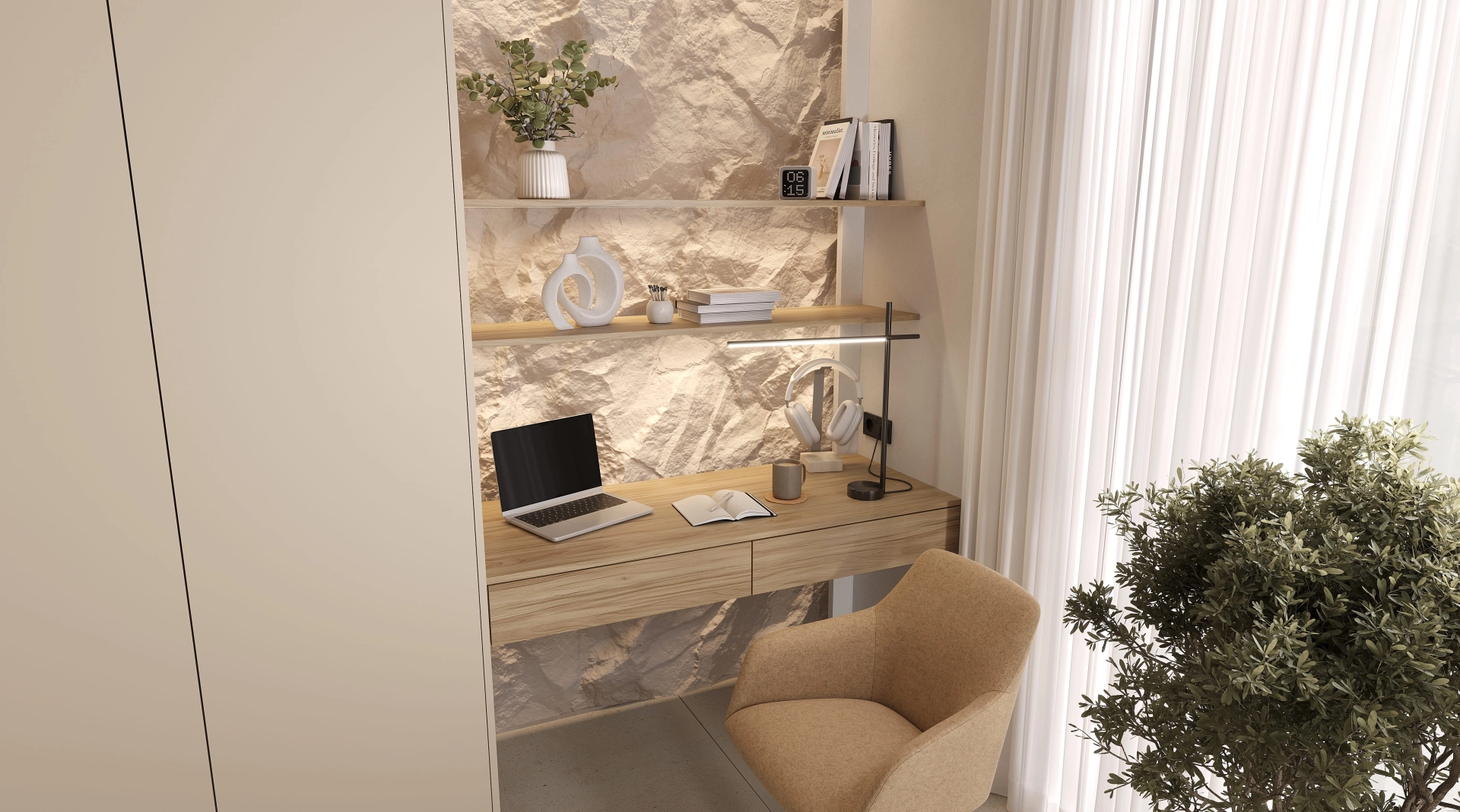 Простота как высшая форма сложности. В этой спальне нет ничего случайного: каждая линия продолжает природный ритм, каждая поверхность говорит на языке материалов. Приглушенная природная палитра создает фон, на котором легко дышится и ясно думается. Никаких ярких акцентов, никаких лишних деталей - только спокойствие, рожденное из уважения к естественной красоте. Освещение меняет настроение комнаты вместе с временем дня: утром оно наполняет пространство свежестью, днем - светом, вечером - мягкими тенями.