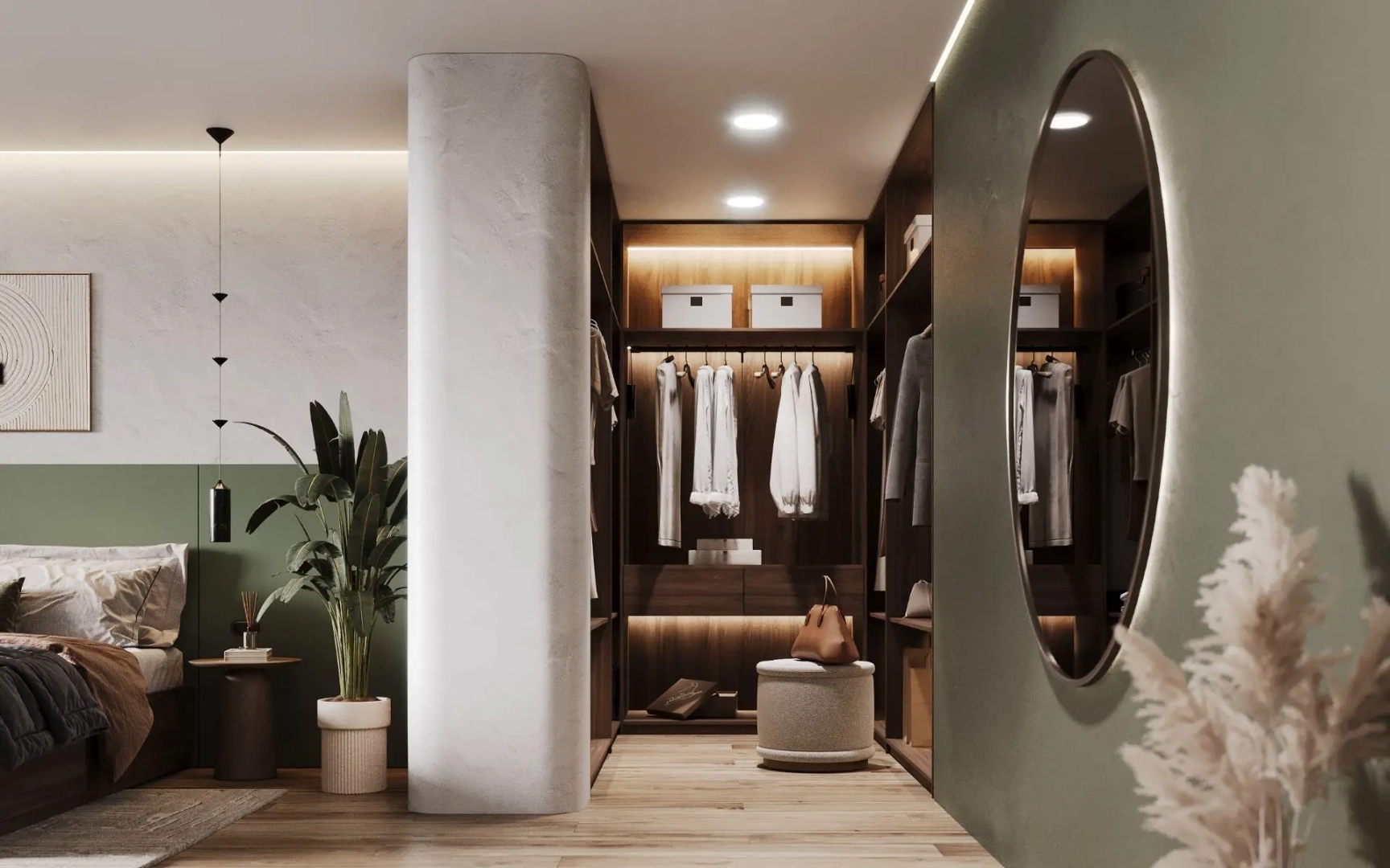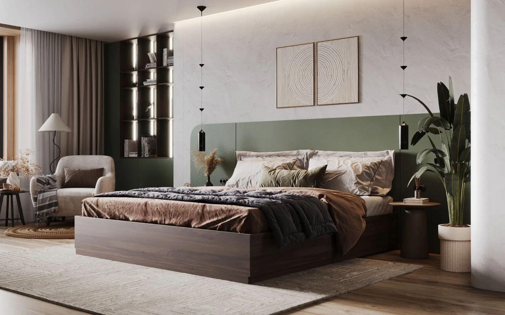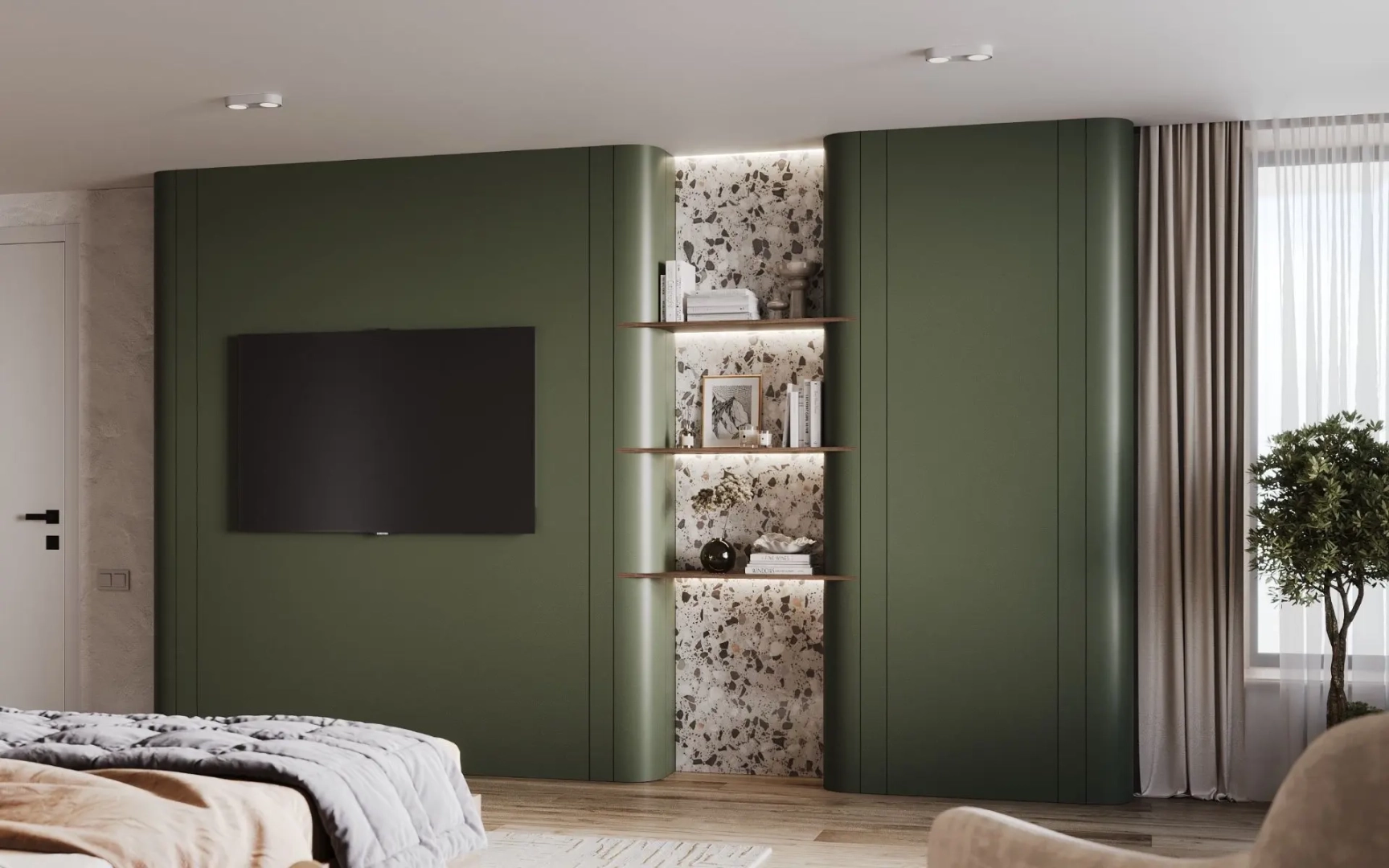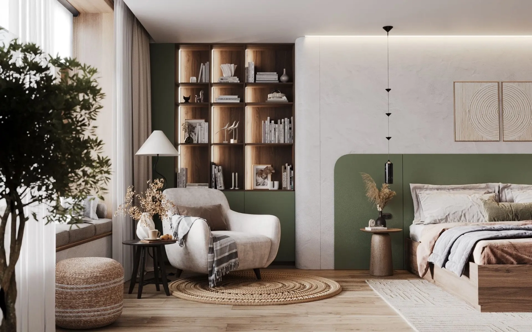 Скругленные формы царят здесь безраздельно. Нет ни одного резкого угла, ни одной прерывистой линии - только плавные переходы, мягкие изгибы, обволакивающие силуэты. Эта архитектура не ограничивает, а укрывает, не разделяет, а соединяет. Зеленый цвет здесь не яркий, не навязчивый, а приглушенный, природный - как листва в утреннем свете. Он становится связующим звеном между мягкой архитектурой и ощущением естественной гармонии.