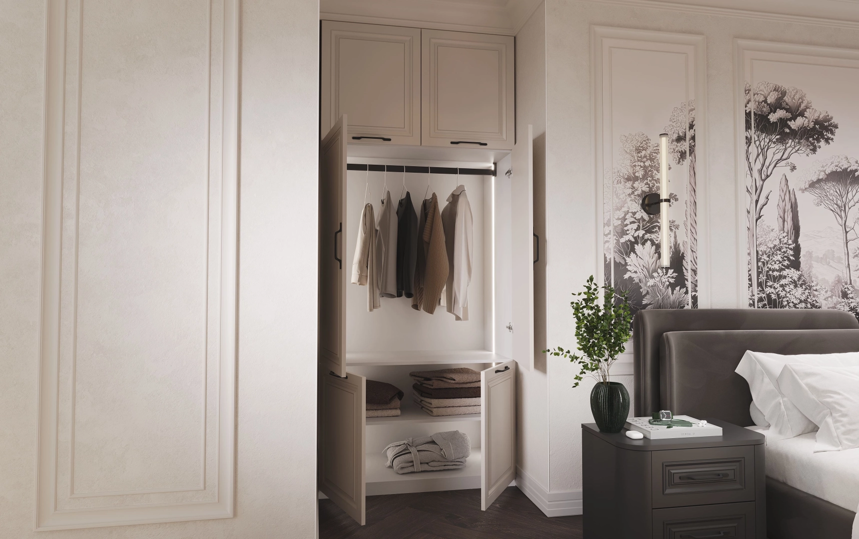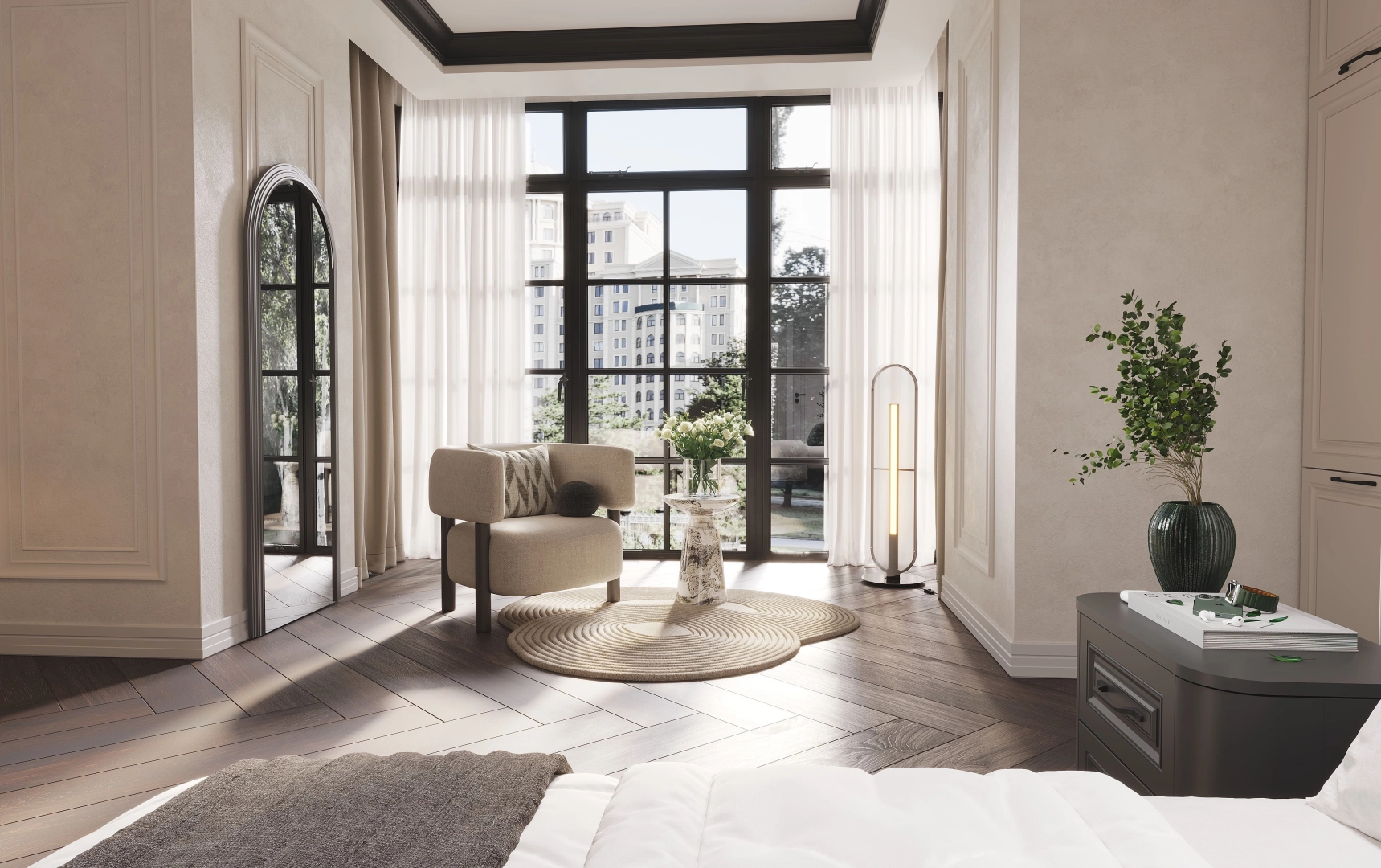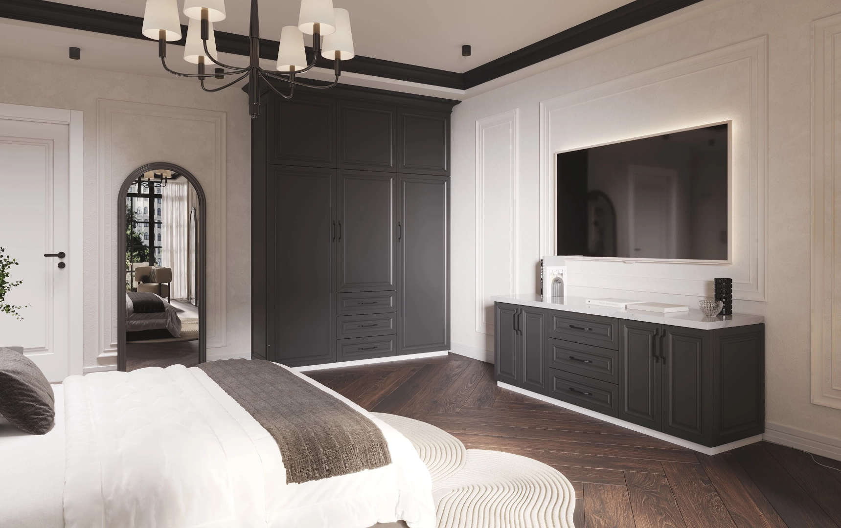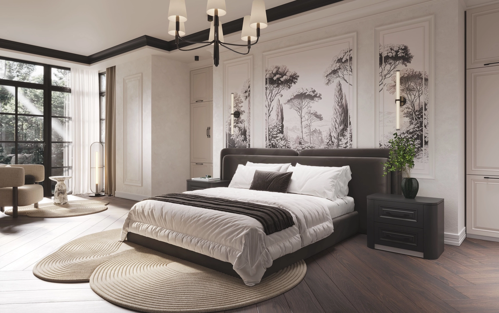 Французский стиль в его современном прочтении - это безупречные пропорции, симметрия и умение создавать элегантность без лишнего. В этой спальне черно-белая гамма становится главным архитектором пространства. Белый цвет расширяет границы, наполняет воздухом, черный добавляет графики, четкости и глубины. Maisonblanc - это место, где французская эстетика раскрывается через минимализм, а роскошь выражается в гармонии.