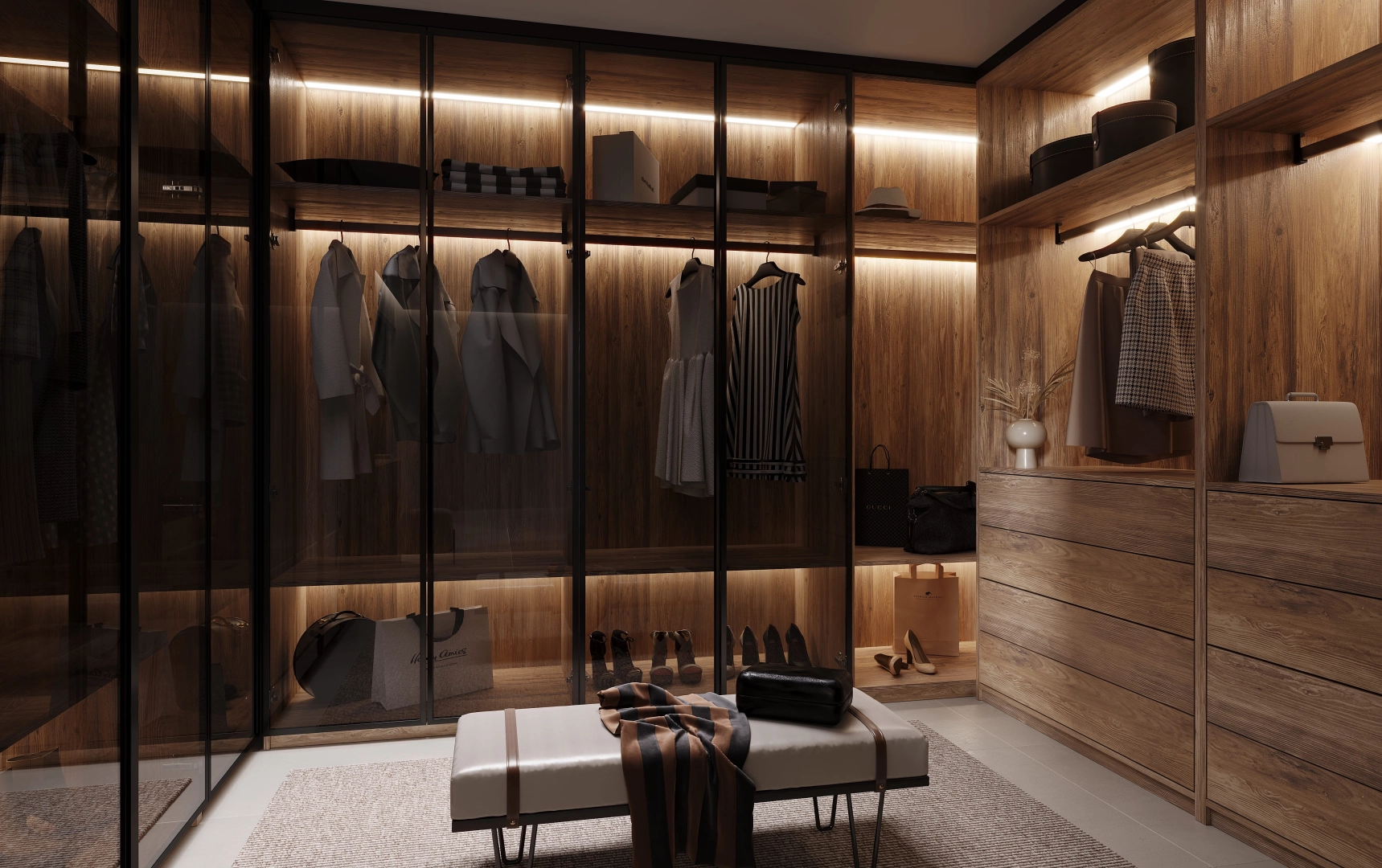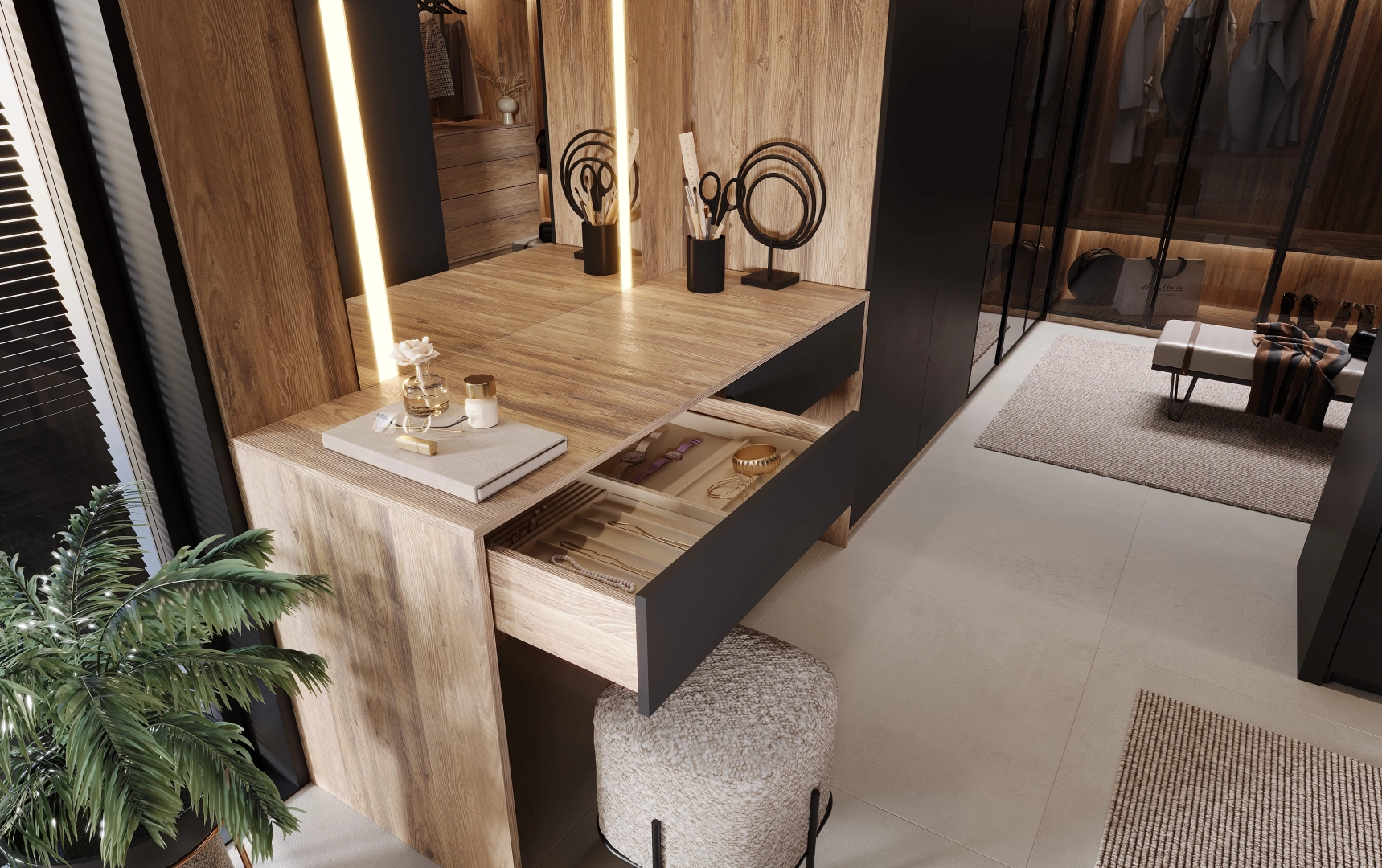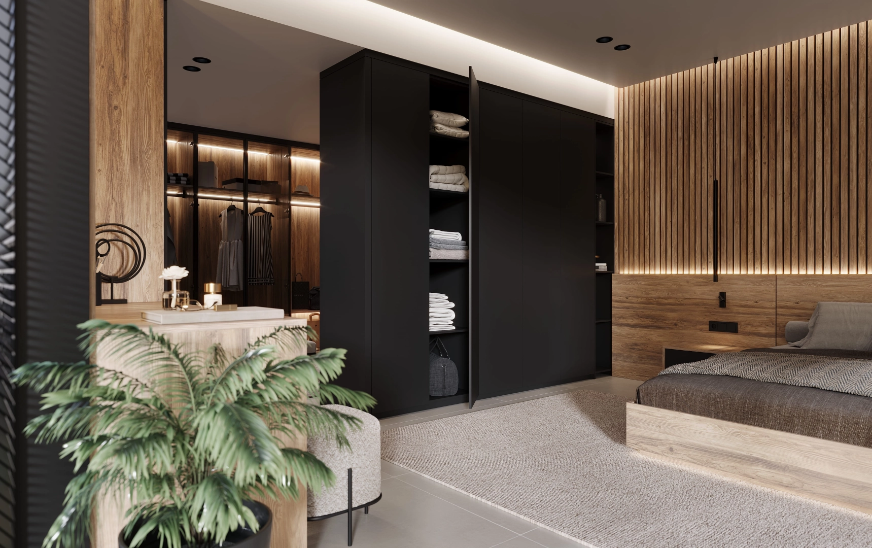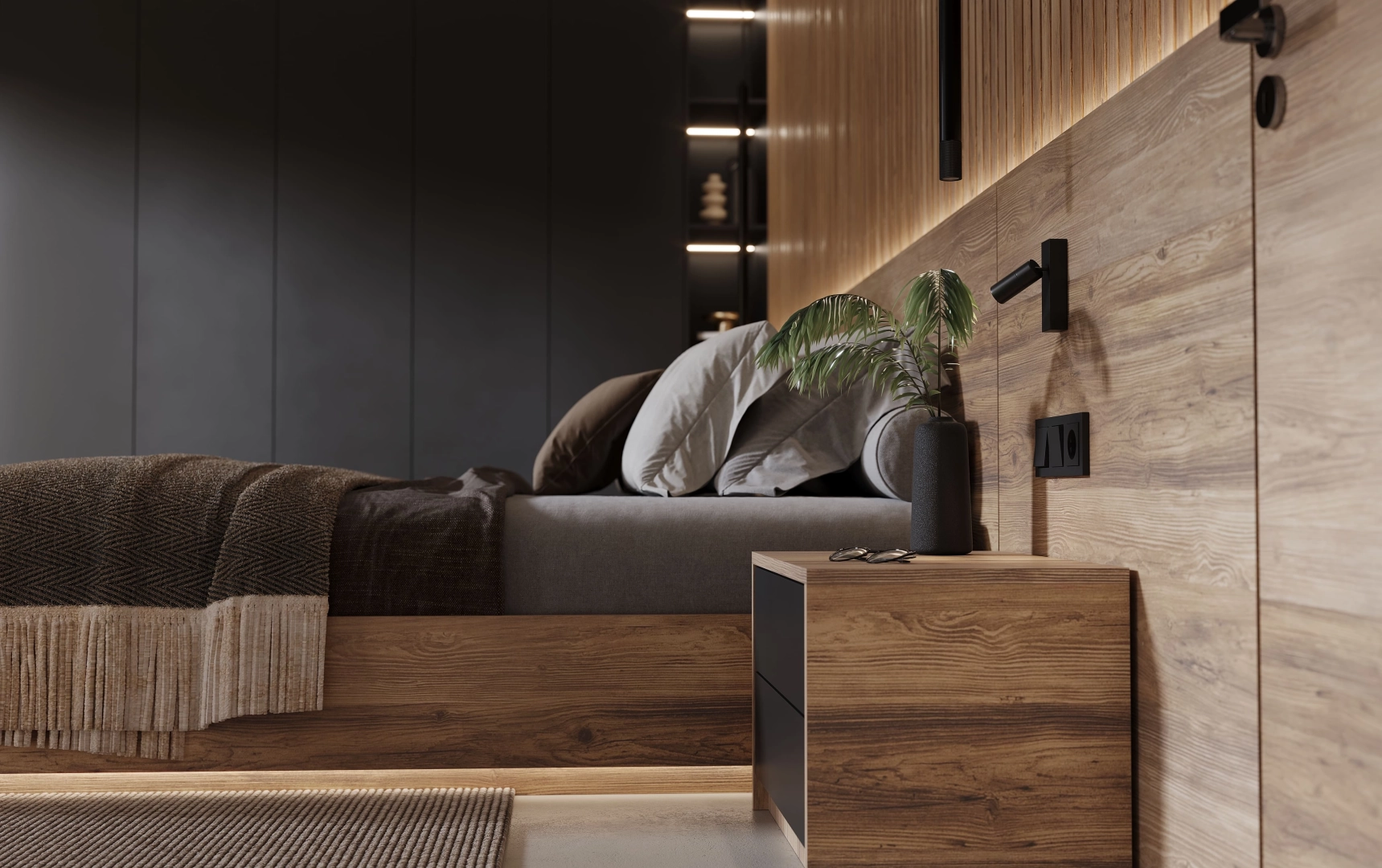 Спальня Shadowood - редкий диалог между индустриальной эстетикой и природным теплом. В ней дух большого города не исчезает, но обретает новое, более глубокое звучание. Дерево здесь выступает не просто материалом, а смысловым акцентом: его текстура смягчает строгость линий, добавляя пространству уюта и естественной гармонии. Это интерьер для тех, кто ценит сложные, неочевидные сочетания.