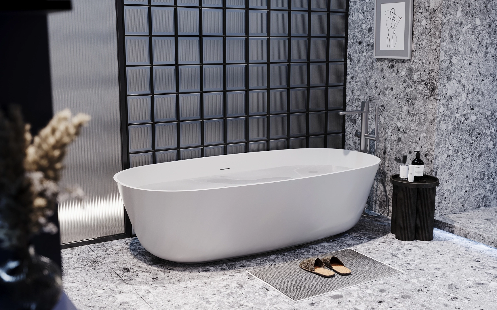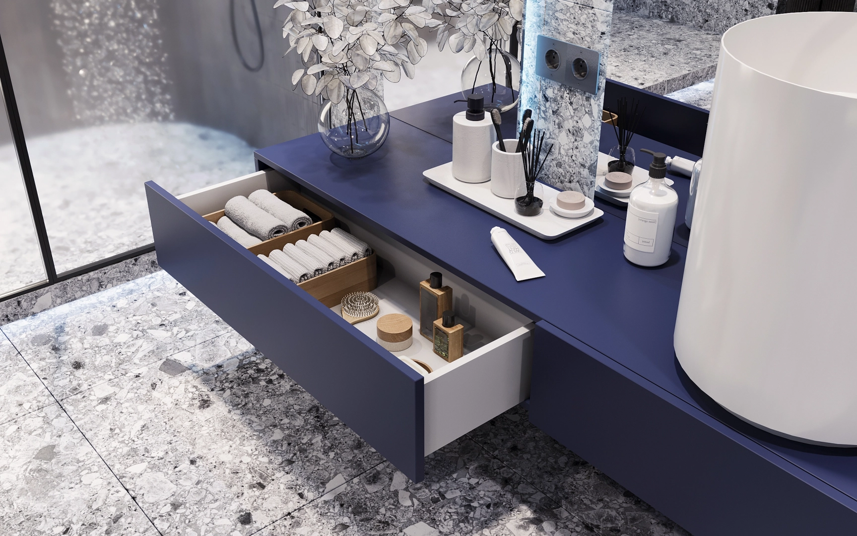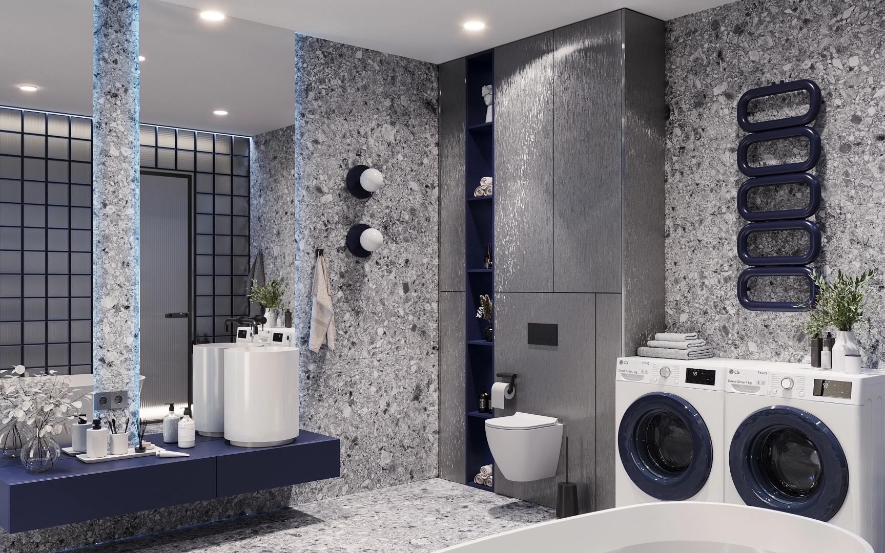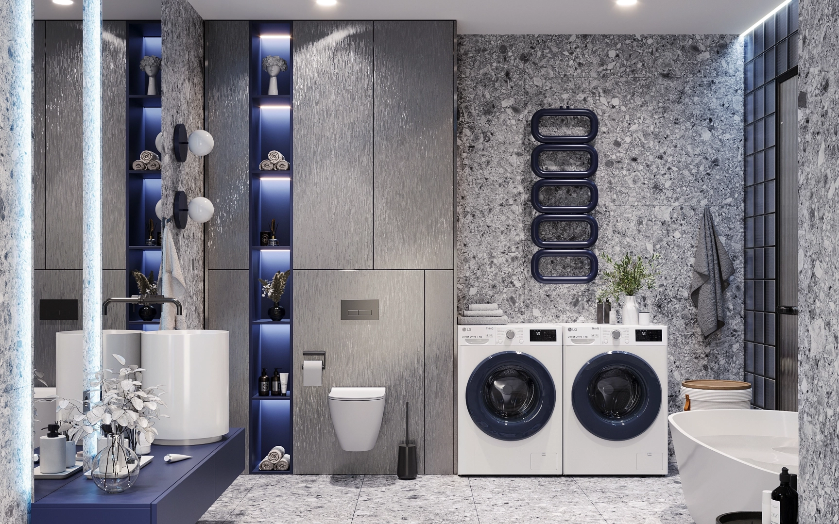 Концепция ванной Gleaming строится на смелом сочетании трёх компонентов: насыщенного колора, выразительных текстур и современных технологий. Ключевой приём — противопоставление глубокого ультрамарина и металлических поверхностей, формирующее двойственное настроение: драматичное, но при этом изысканное.