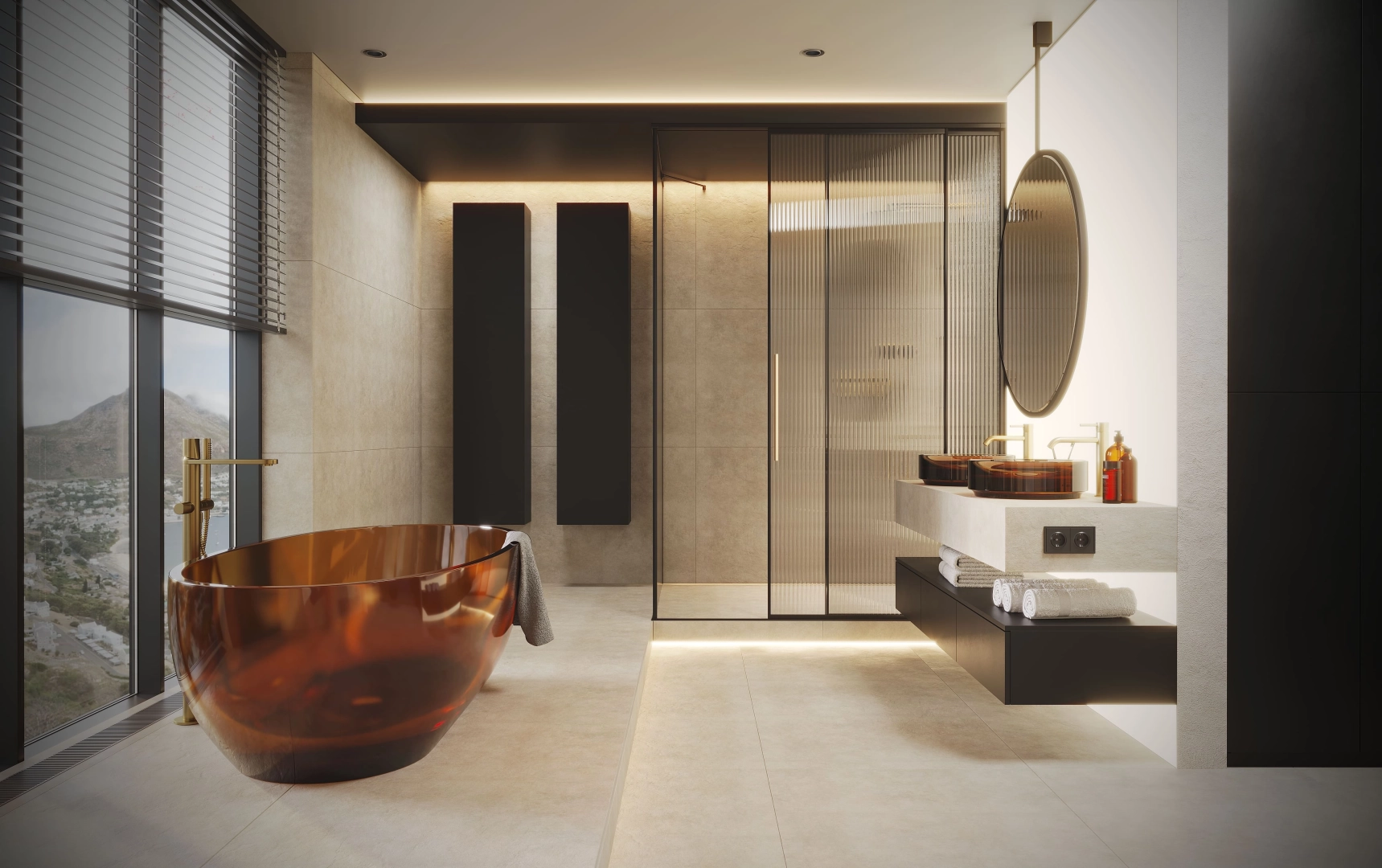 Ванная комната, которая заставляет почувствовать пульс современного города. Минимализм, функциональность и смелые акценты создают атмосферу свободы и гармонии. Коричневая акриловая ванна - это дизайнерский ход, который преображает пространство. Её теплый оттенок создают уютный контраст с блеском стекла и металла. У панорамных окон она выглядит особенно эффектно - будто островок спокойствия в сердце мегаполиса. Идеальное пространство для тех, кто ценит инновации и стиль городской жизни.